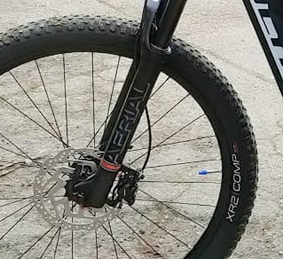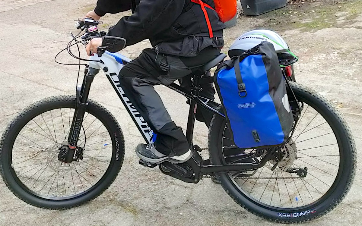 descrizione / segni particolari: Mountain bike elettrica, telaio bianco con la scritta OLYMPIA in nero, forcella nera ammortizzata con la scritta Arial, freni a disco, specchietto sul manubrio lato sinistro, campanello rosa a fiori, 2 borse blu marca Ortlieb, cavalletto