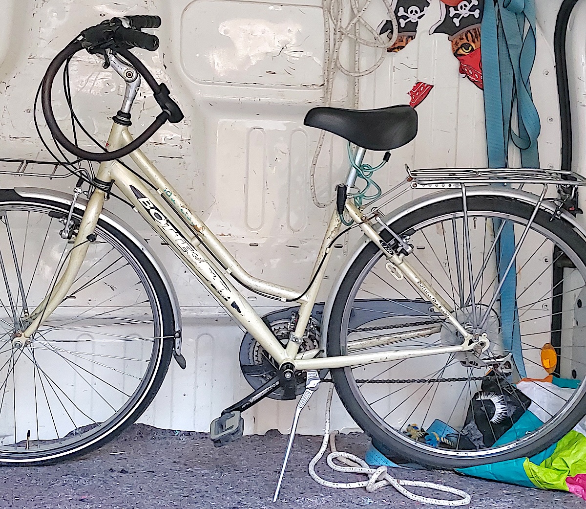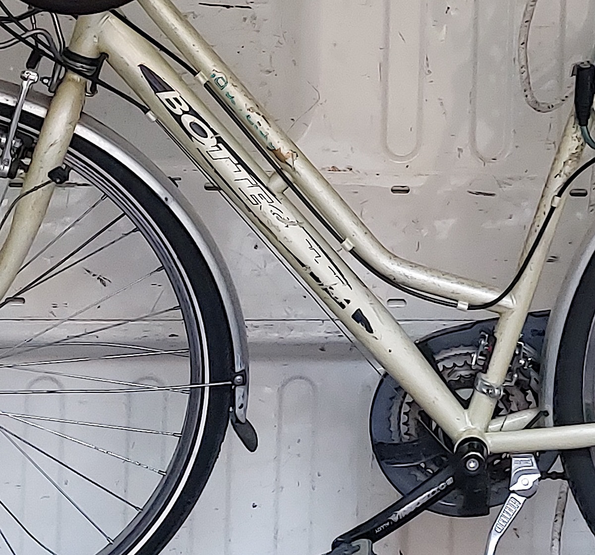 City bike da donna, telaio colore beighe con la scritta BOTTECCHIA su nero, due portapacchi argento, attacco manubrio regolabile, manopola SX bucata, adesivi Bike Empire e Amarilli Caffé