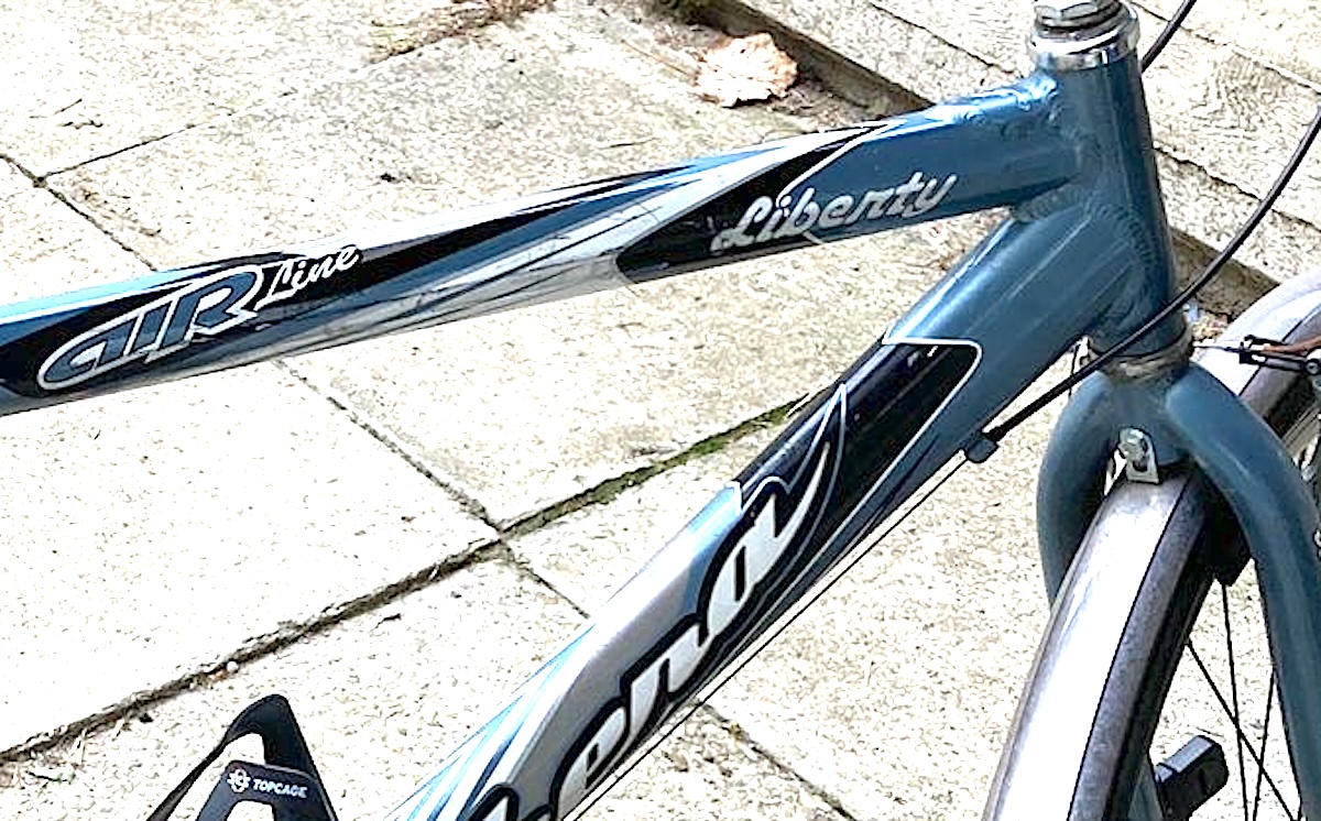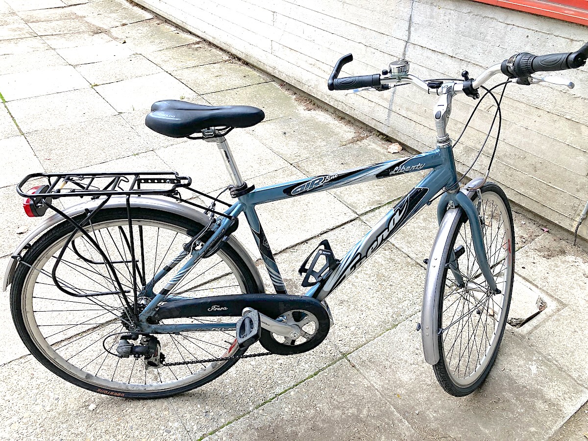City bike da uomo, telaio blu cone la scritta DRERA in bianco, tubo verticale telaio rovinato, manopole tagliate alle estremità e chiuse con un tappo, portaborraccia Top Cage, sellino nuovo Decathlon