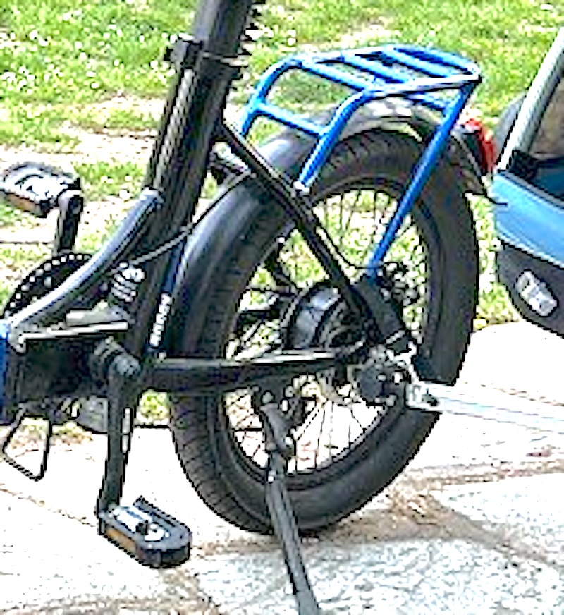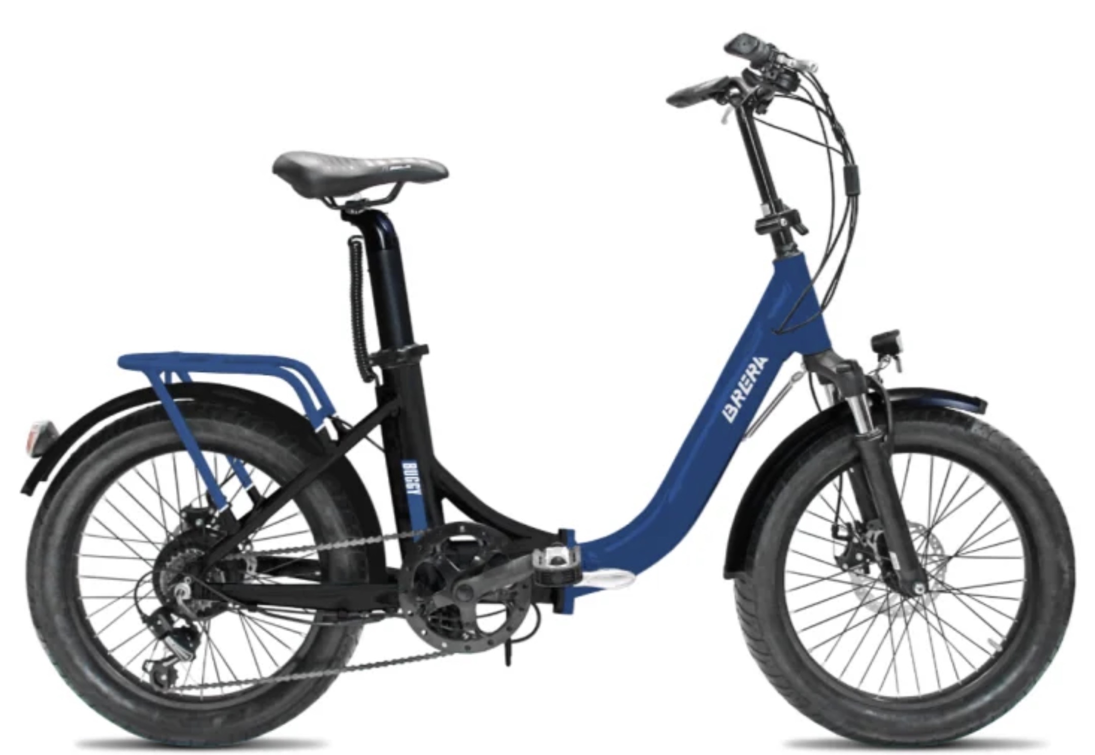 descrizione / segni particolari: Bici pieghevole elettrica, telaio nero e blu con la scritta BRERA in bianco, forcella ammortizzata, freni a disco, portapacchi blu, campanello Decathlon nero a destra sul manubrio, un collante a sfere che ferma il cavalletto, un polsante rotto nel fanale posteriore, attacco per carello cargo