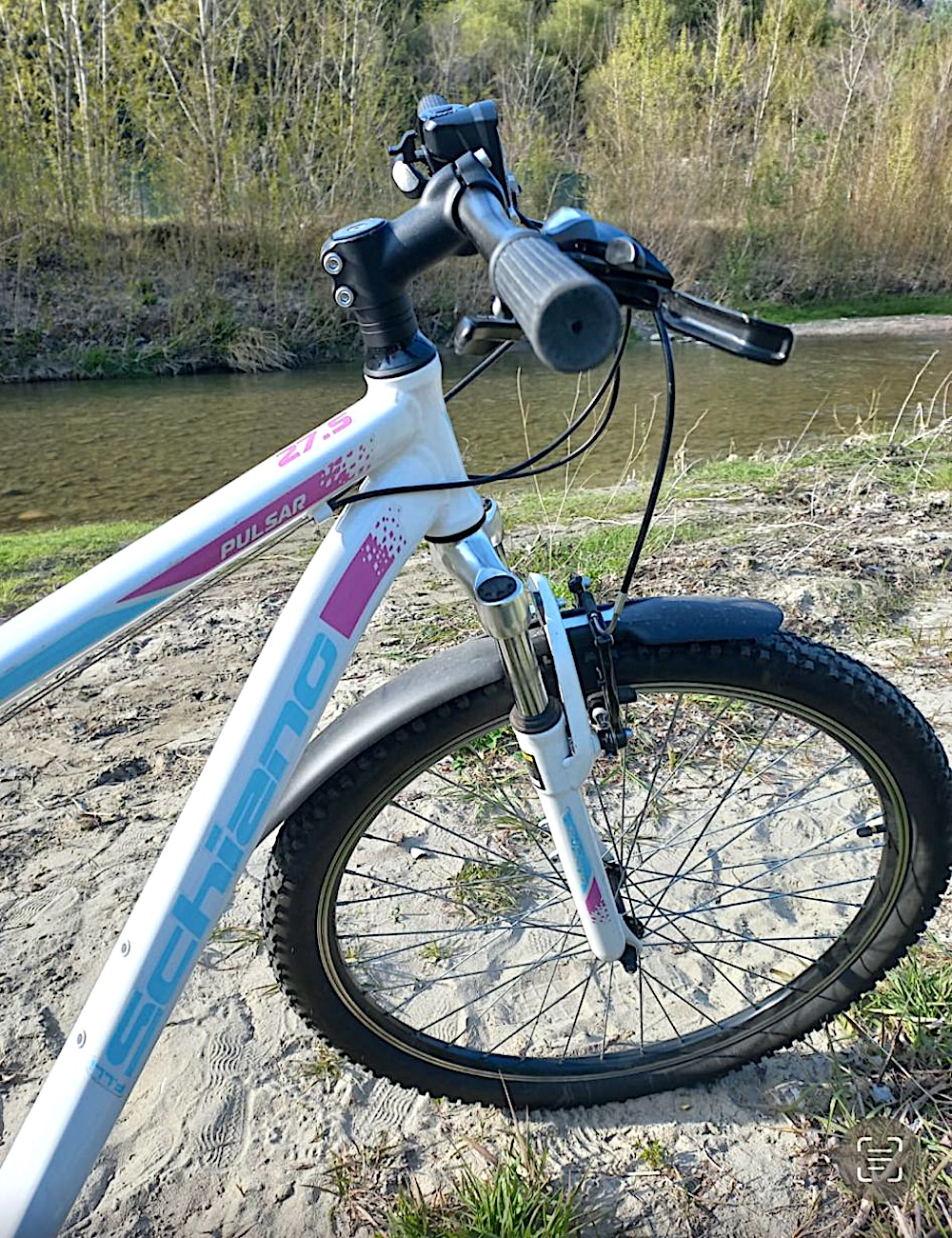 Mountain bike, telaio bianco con la scritta SCHIANO in blu e PULSAR in bianco su rosa, ruote da 27.5", forcella bianca ammortizzata