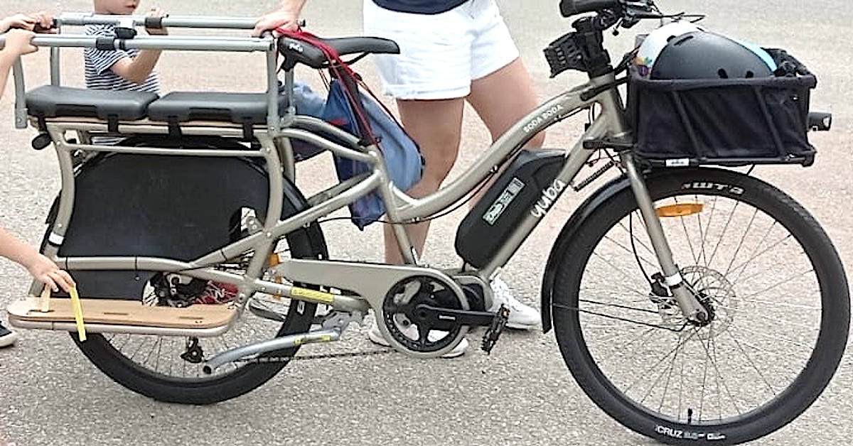 Bici elettrica con seggiolino posteriore doppio, telaio colore oro con le scritte YUBA e Boda Boda, cestino anteriore nero, cavalletto doppio, freni a disco