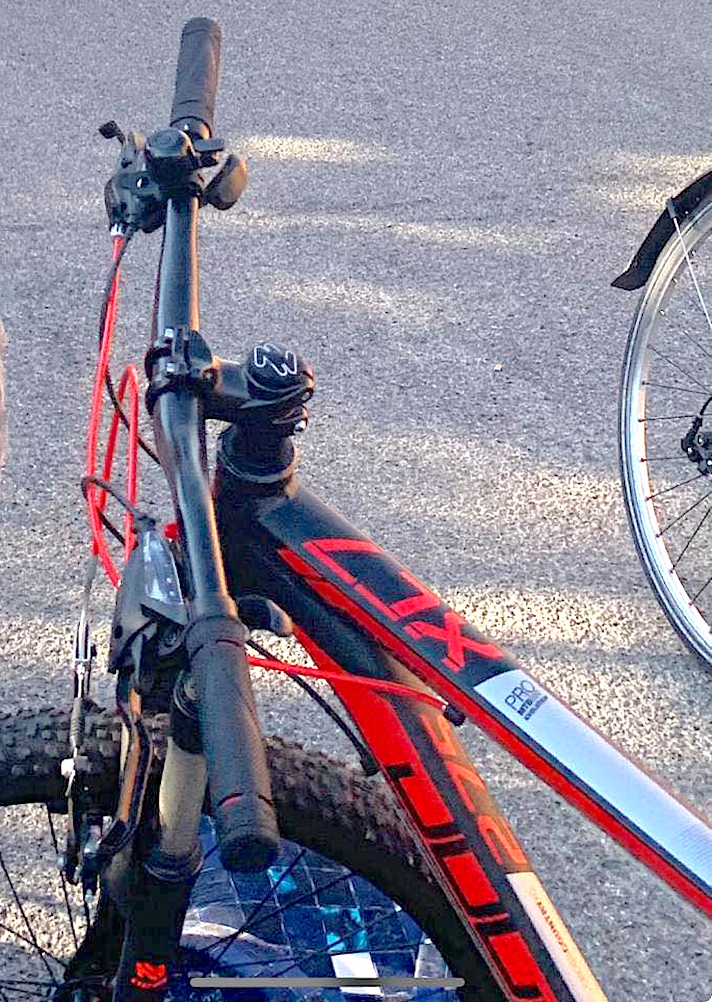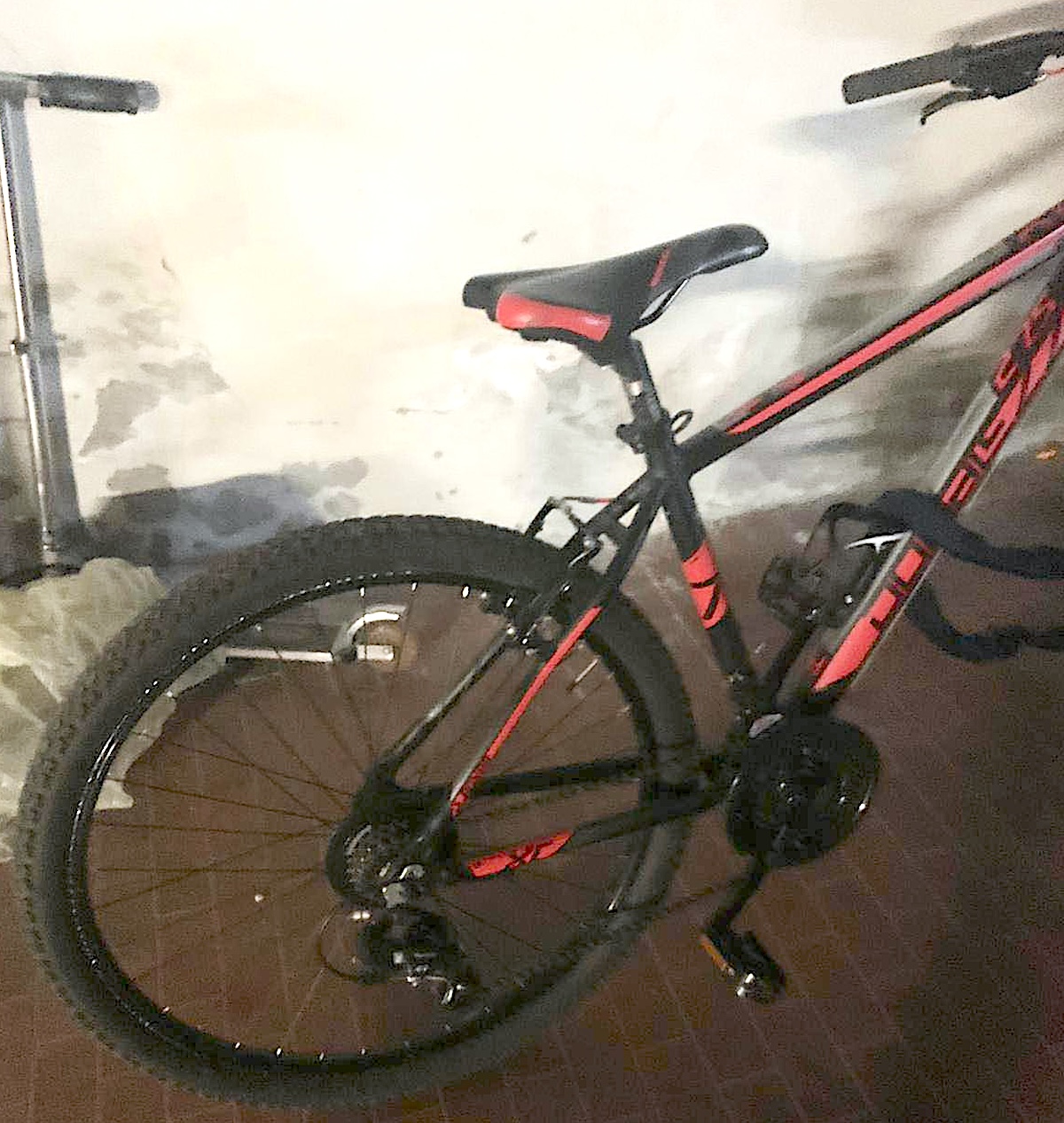 descrizione / segni particolari: Mountaion bike, telaio nero e rosso con le scritte DOUBLE ZZ e XC7, forcella nera ammortizzata, ruote da 27.5, portaborraccia in plastica nera, cerchione ruota posteriore segnato e con copertone dietro diverso (marca Decathlon)