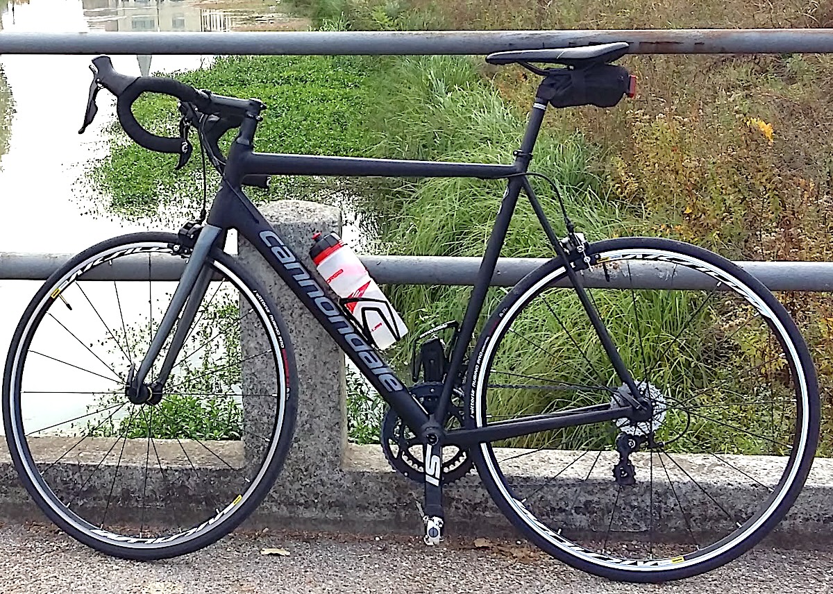 Bici da corsa, telaio nero con la scritta CANNONDALE in grigio, forcella dritta colore grigio, cerchioni Mavic Aksium, freni neri, nastro nero leggermente usurato sulla sinistra, doppio portaborraccia