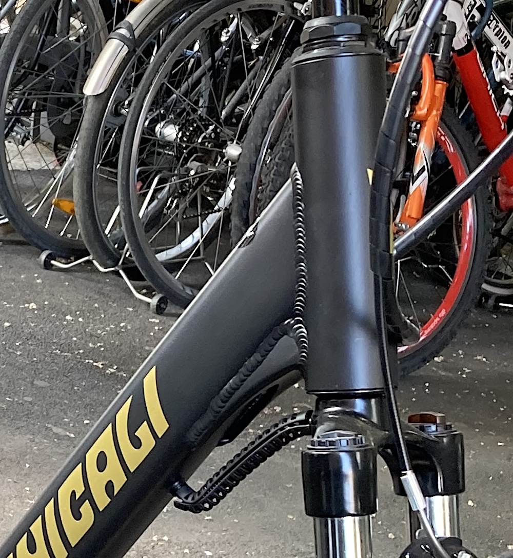 Bici elettrica da donna, telaio nero con la scritta DOMENICALI in giallo, forcella ammortizata, motore nel mozzo posteriore