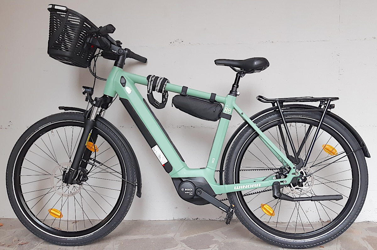 Bici elettrica, telaio verde chiaro con le scritte WINORA e R8 in bianco, forcella nera ammortizzata, freni a disco, cestino a manubrio asportabile, parafanghi neri, portapacchi posteriore
