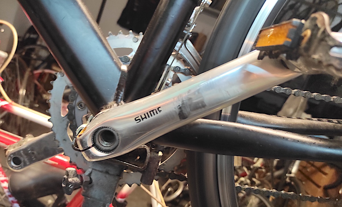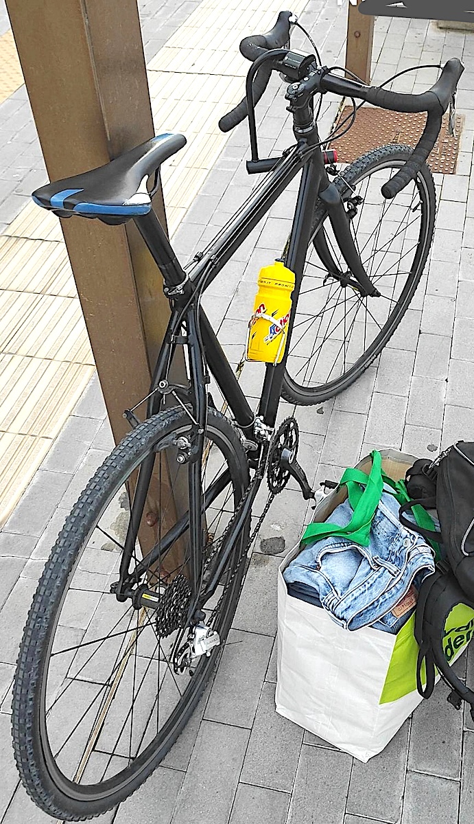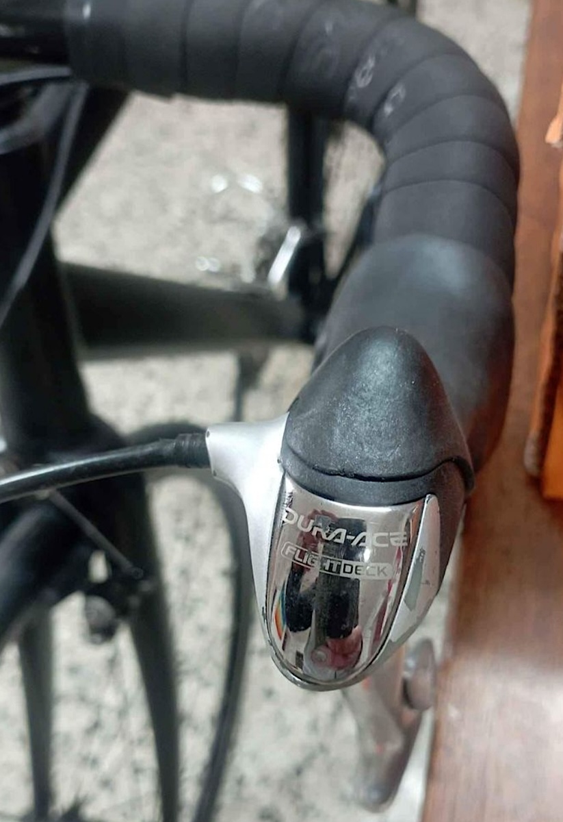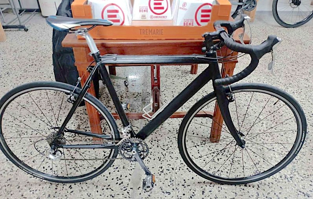 Telaio da ciclo-cross Ridley crosswind verniciato tutto nero. Deragliatore posteriore Shimano Dura-ace, guarnitura Shimano argento, freni cantilever FRM Neri, copertoni tacchettati maxxis, manubrio da corsa, porta cellulare.