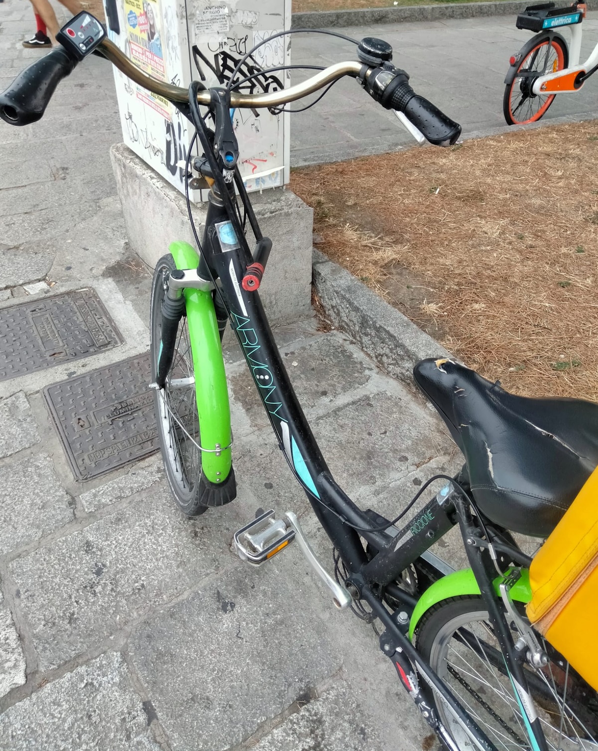 Bici elettrica, telaio nero con le scritte ARMONY e RICCIONE in colore blu-verde, parafanghi verde acceso, forcella ammortizzata,