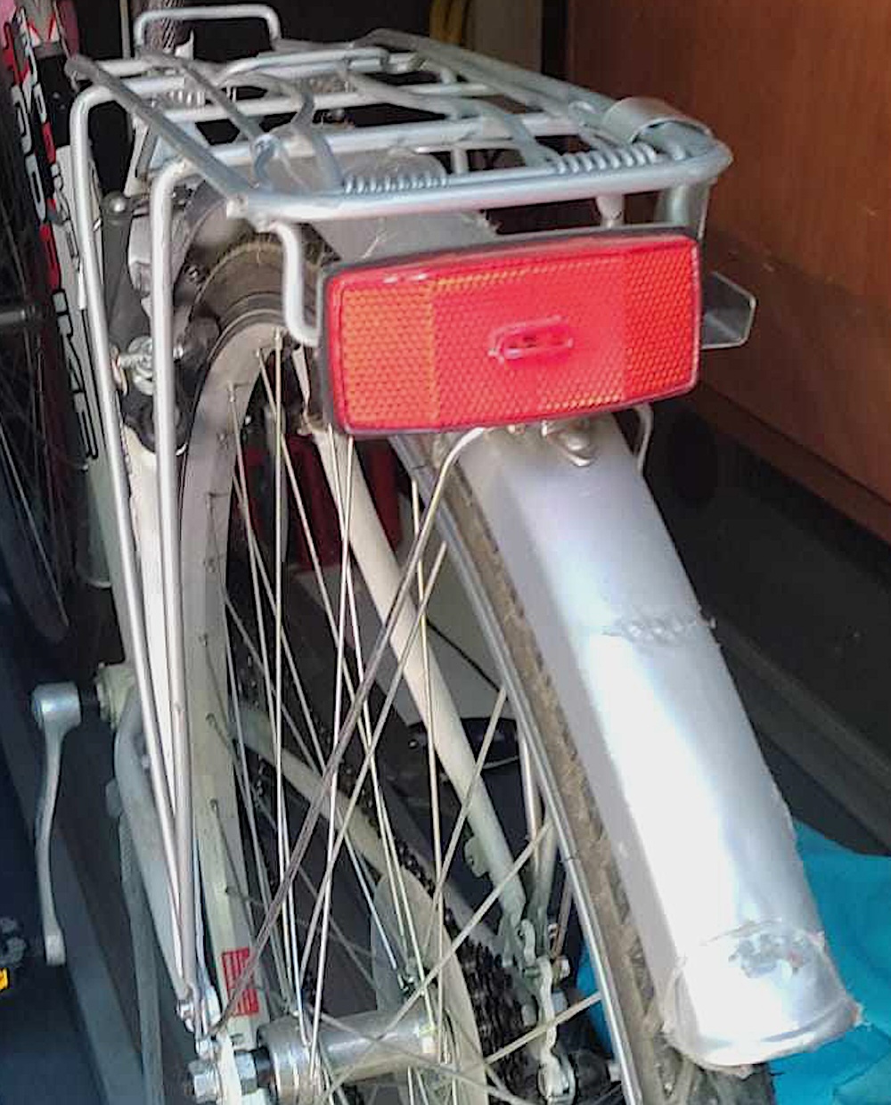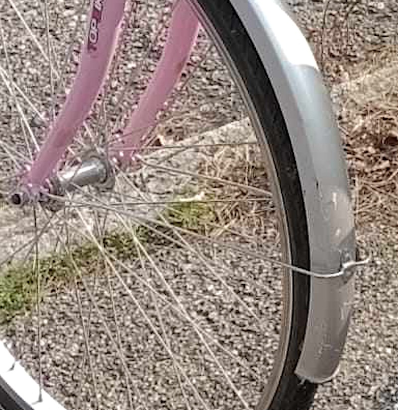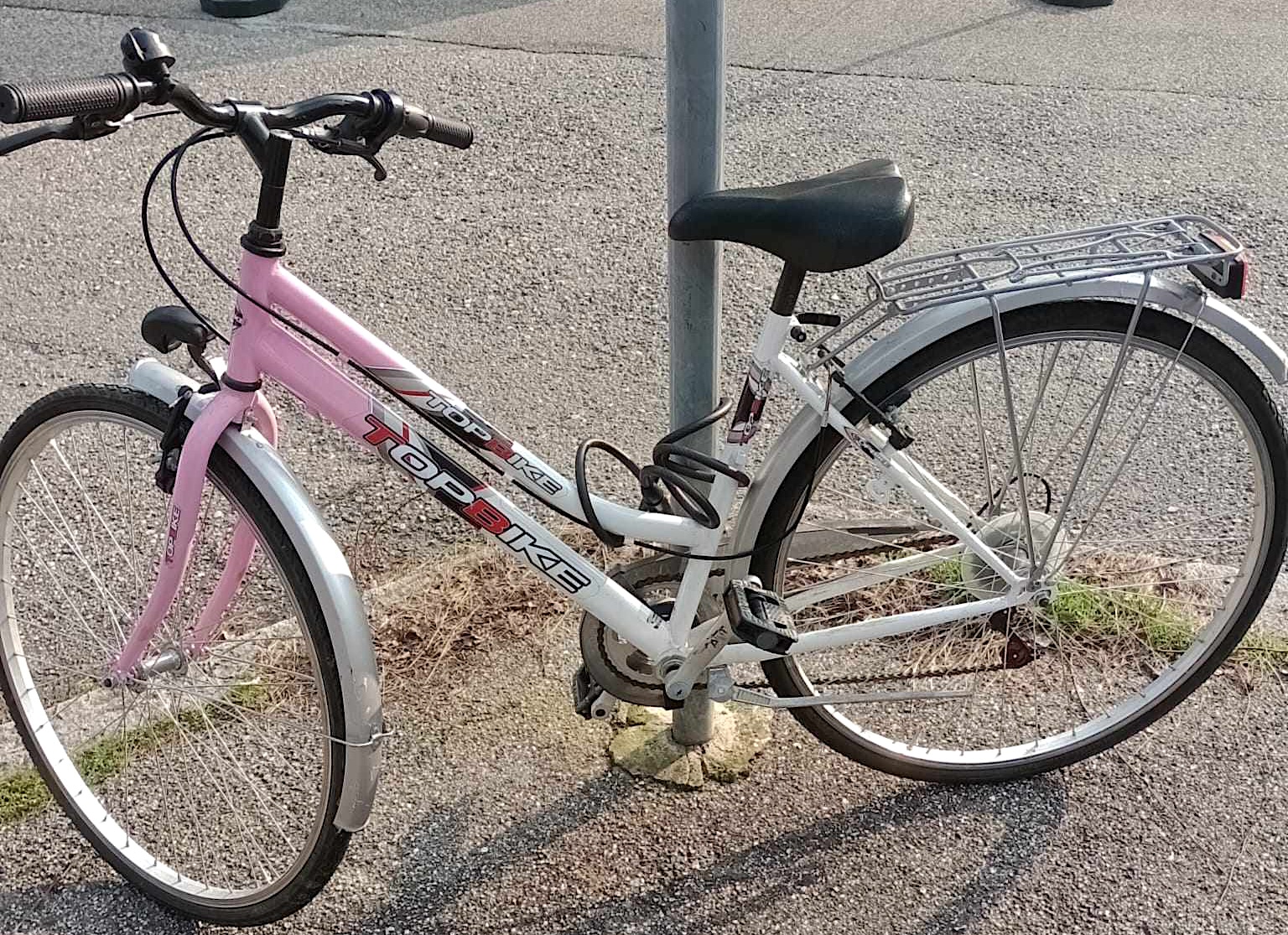 City bike da donna, telaio rosa davanti e bianco dietro con la scritta TOPBIKE in bianco e rosso, parafanghi colore argento entrambi danneggiati, portapacchi posteriore argento