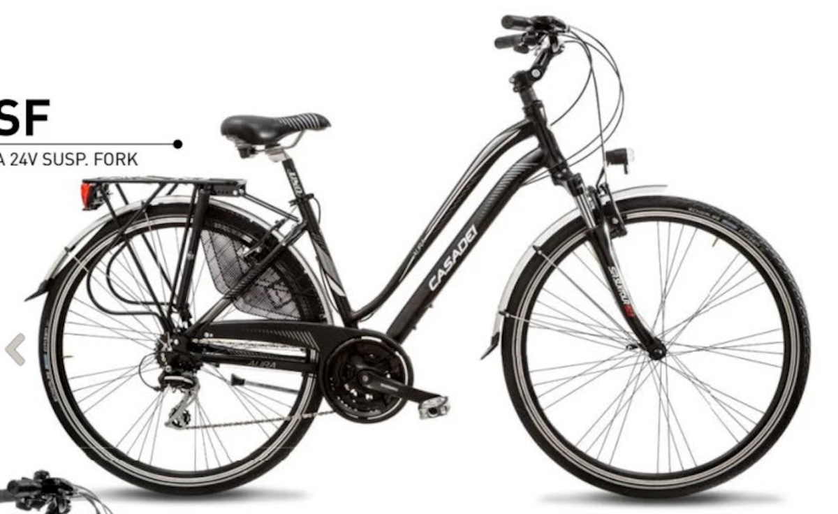 descrizione / segni particolari: City bike da donna, telaio nero con la scritta CASADEI in bianco, forcella anteriore nera ammortizzata, portapacchi posteriore nero, cestino a fronte, campana cromato argento, estremità manubrio, porta-telefono, seggiolino per bambini grigio