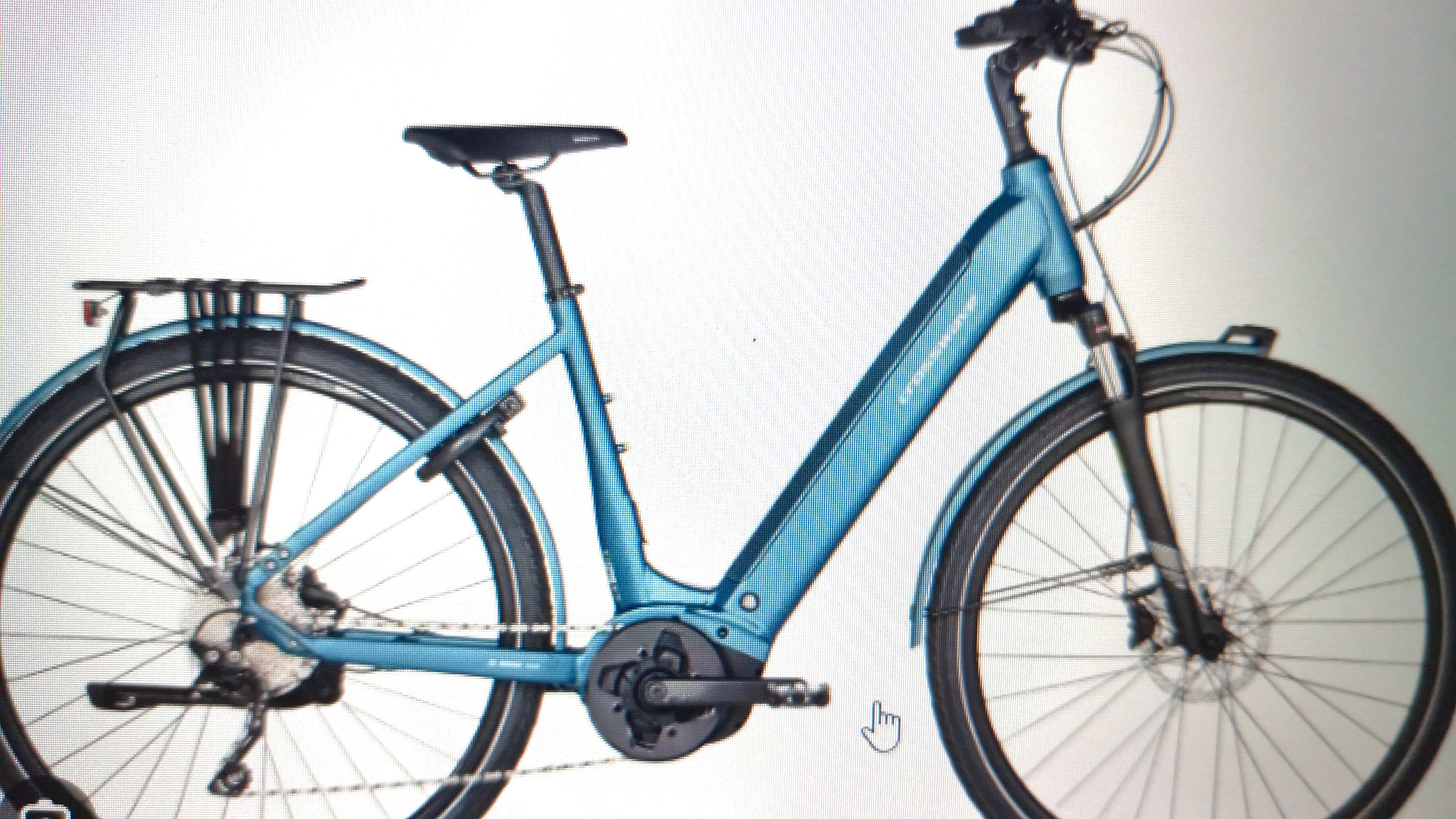 Bici elettrica, telaio blu, forcella ammortizzata, freni a disco, montava dietro seggiolino colore nero