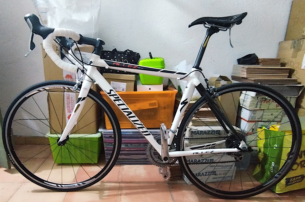 descrizione / segni particolari: Bici da corsa, telaio bianco e nero cone la scritta SPECIALIZED in nero e ALLEZ in rosso, sella nera marca SMP con laccettino con bandiera italiana sotto,