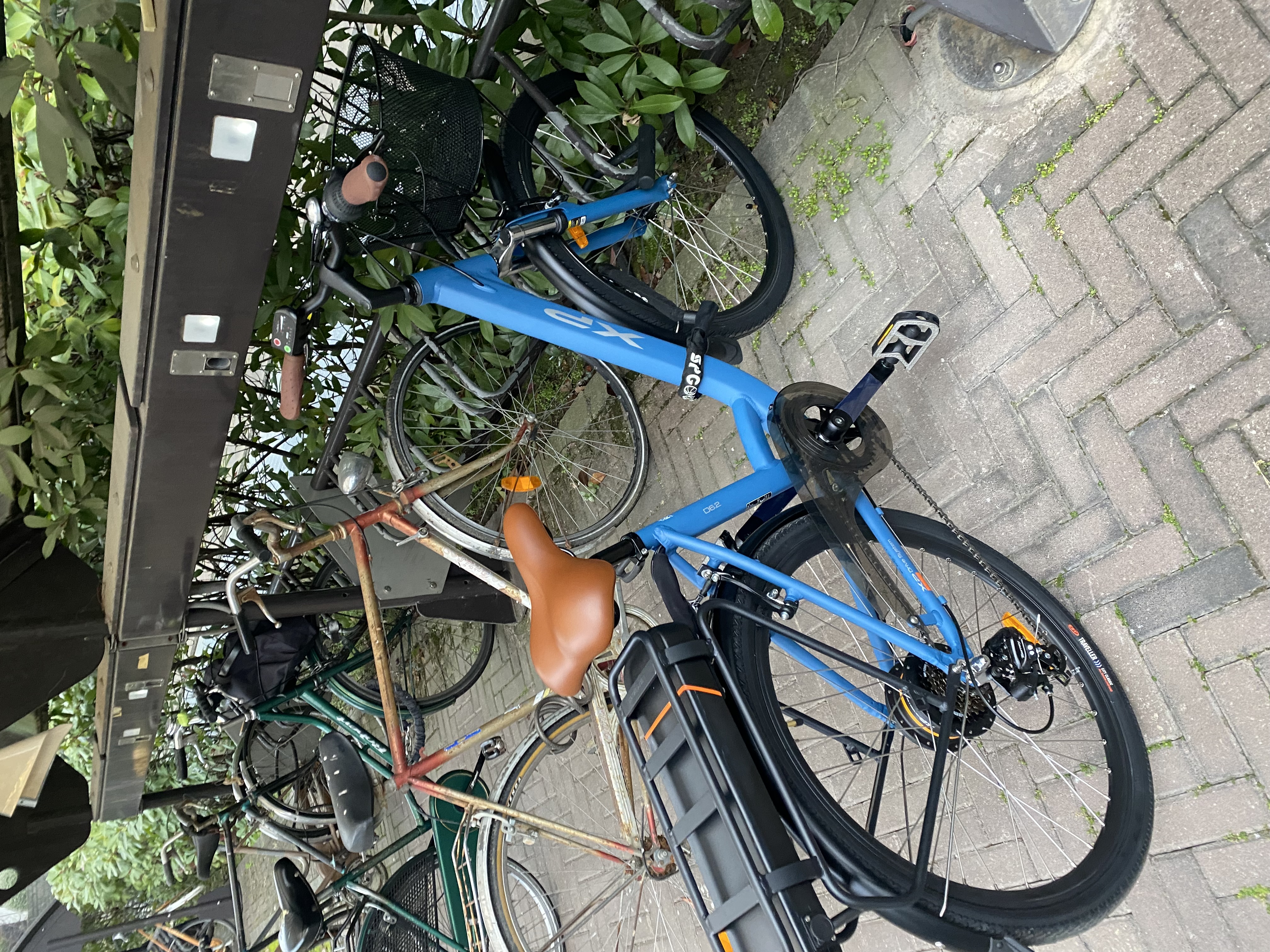 Bici elettrica, telaio blu, cesto davanti