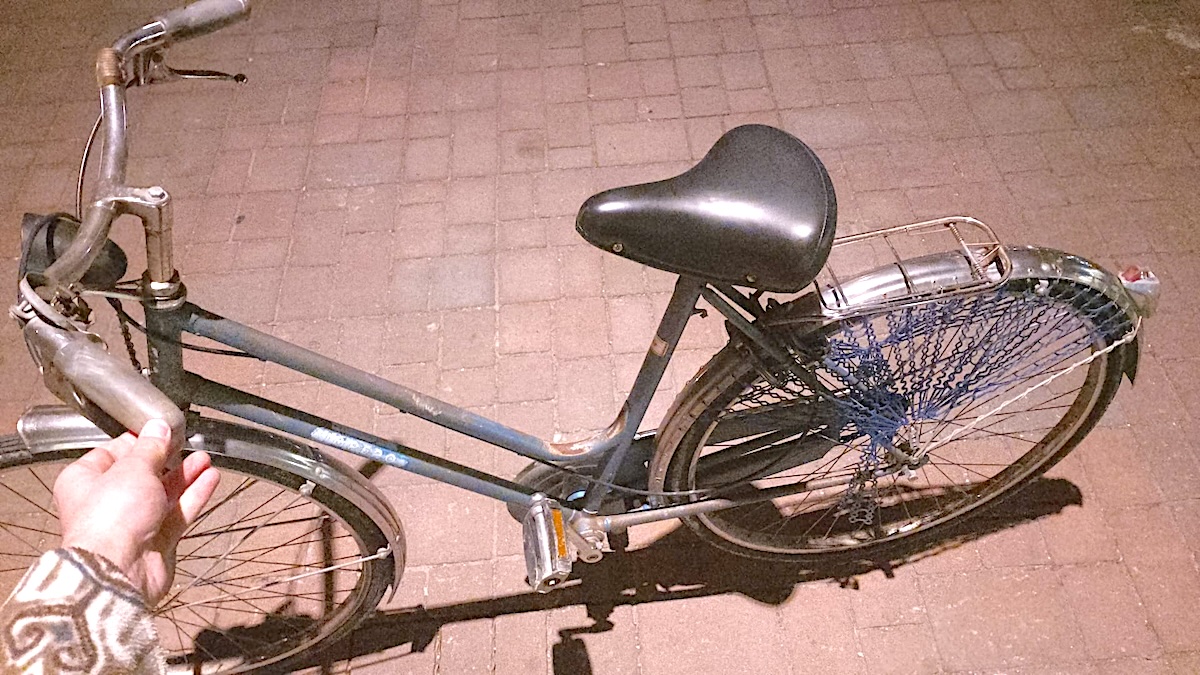 Vecchia city bike da donna, telaio blu / azzurra con la scritta IMPERO in bianco, campanello rotto, fanale anteriore, carter catena chiuso con finestrino, parafanghi argento
