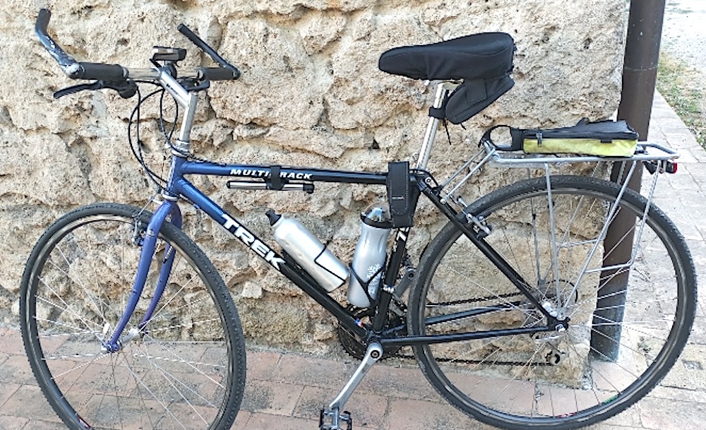Mountain bike, telaio piccolo viola/blu davanti e nero dietro con le scritte TREK e MULTITRACK in bianco, manubrio dritto con corna, portapacchi posteriore colore argento, due portaborracce nere diverse