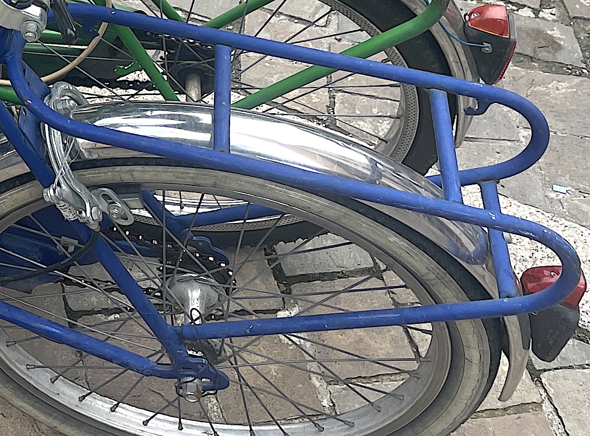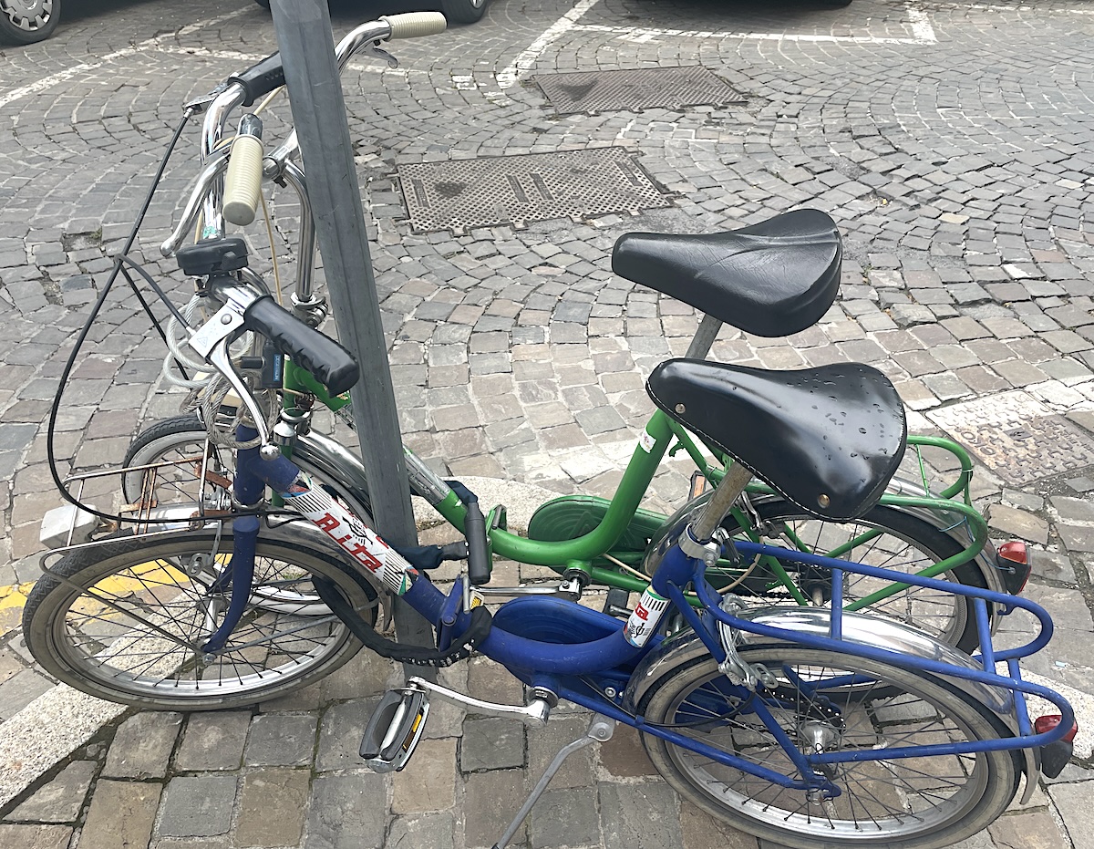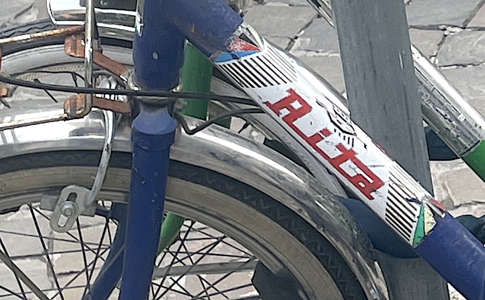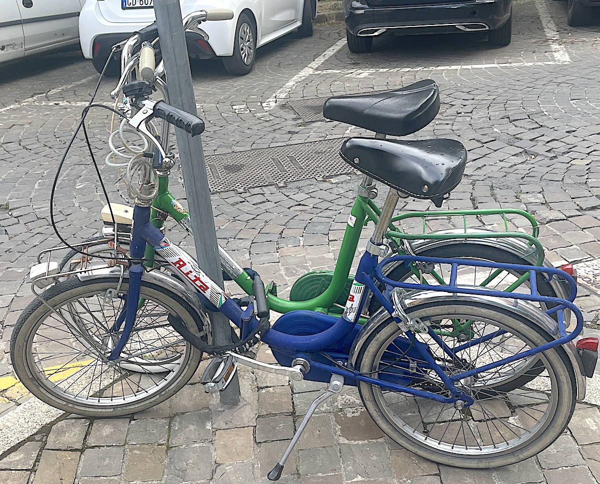 Bici pieghevole, telaio blu con la scritta RITA in rosso, bollino verde sul manubrio, parafanghi argento, due portapacchi