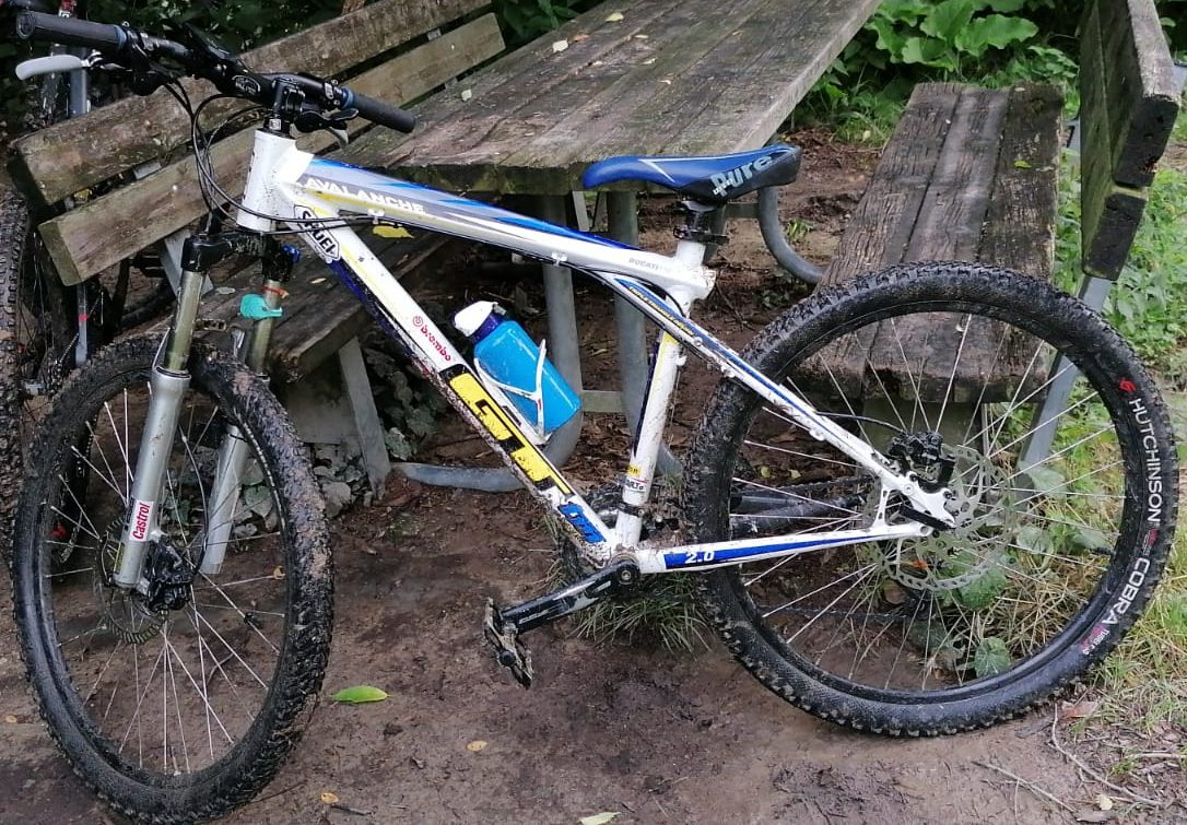 Mountain bike, telaio bianco e blu con la scritta GT in giallo e Avalanche in bianco, forcella argento ammortizzata, freni a disco, portaborraccia in plastica bianca