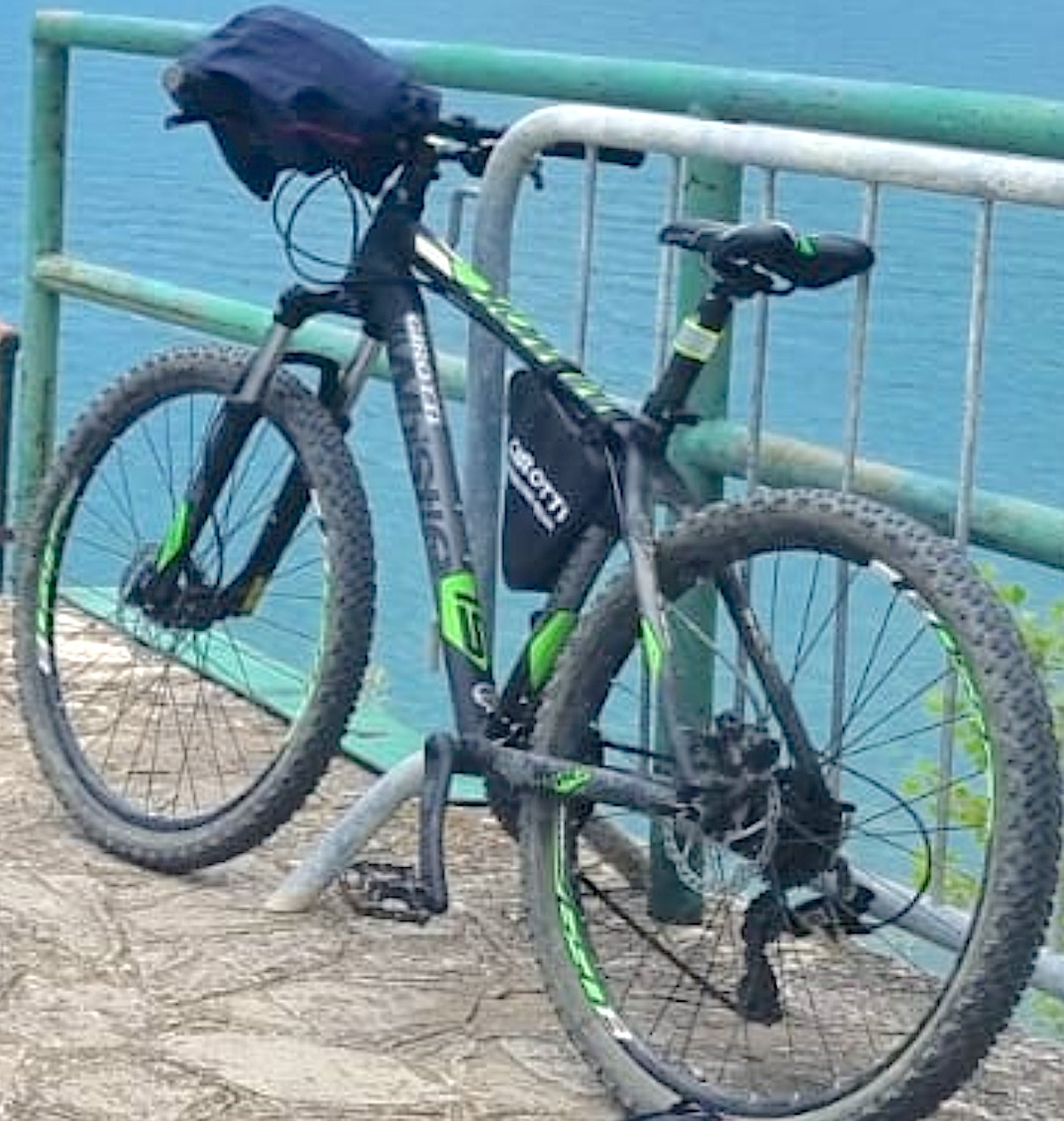 descrizione / segni particolari: Mountain bike, telaio grigio con la scritta WHISTLE in grigio più scuro, SL in nero e Girotti in bianco, forcella nera ammortizzata, freni a disco, pedali stile piattaforma in nylon verdi con viti nere, un sellino ergonomico non originale, borse da viaggio