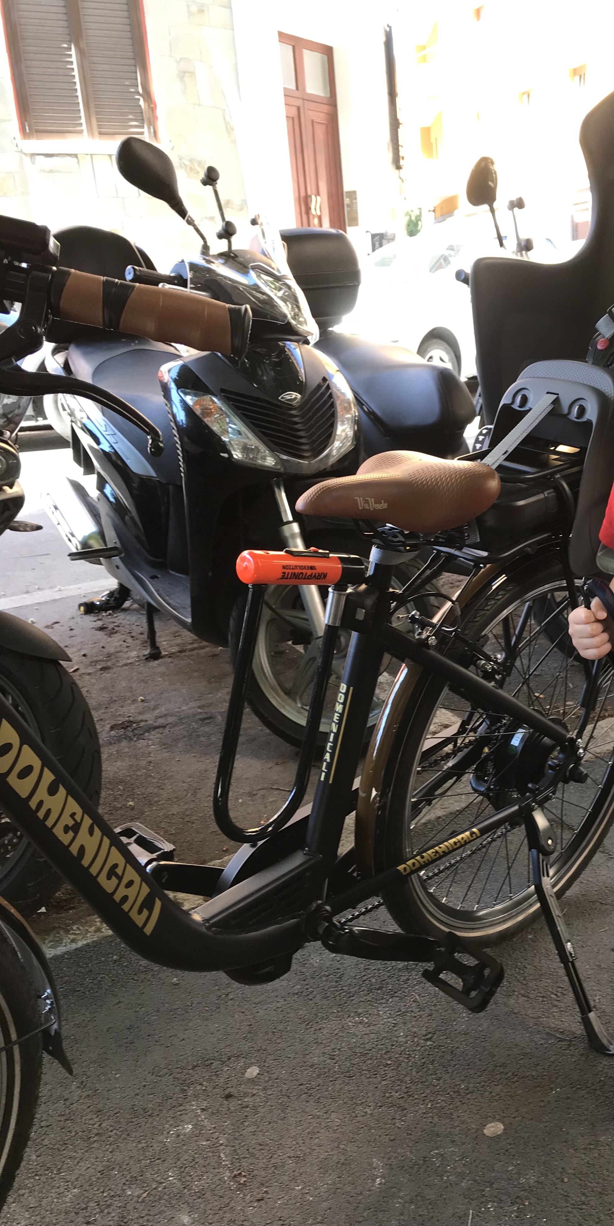 Bici elettrica, telaio nero con le scritta DOMENICALI in giallo, sella e manopole colore pelle, parafanghi marrone, attacco per u-lock Kryptonite sul tubo sella