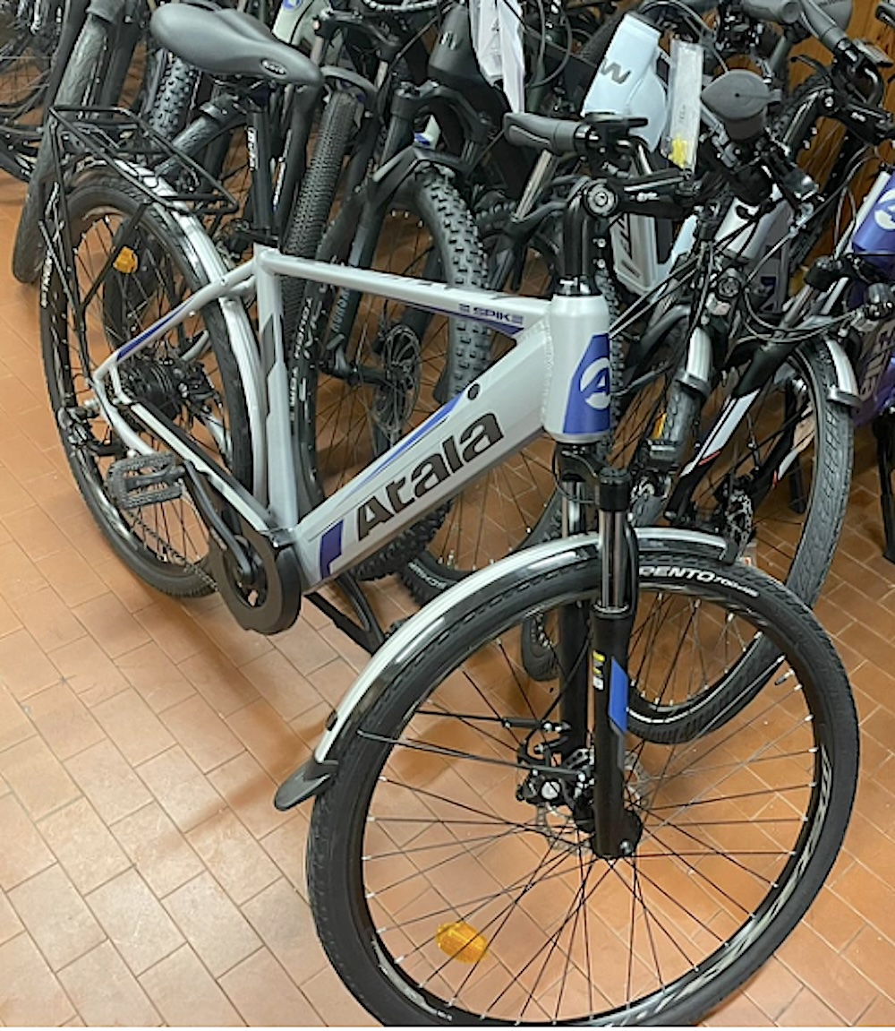 Bici elettrica, telaio grigio con le scritte ATALA e Spike in nero, forcella nera ammortizzata, freni a disco, portacellulare, adesivo del negozio Castagnini (Zola) dove acquistata la bici