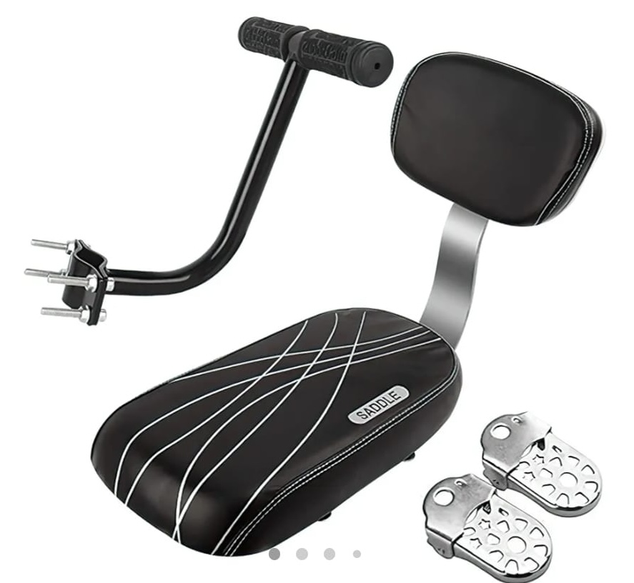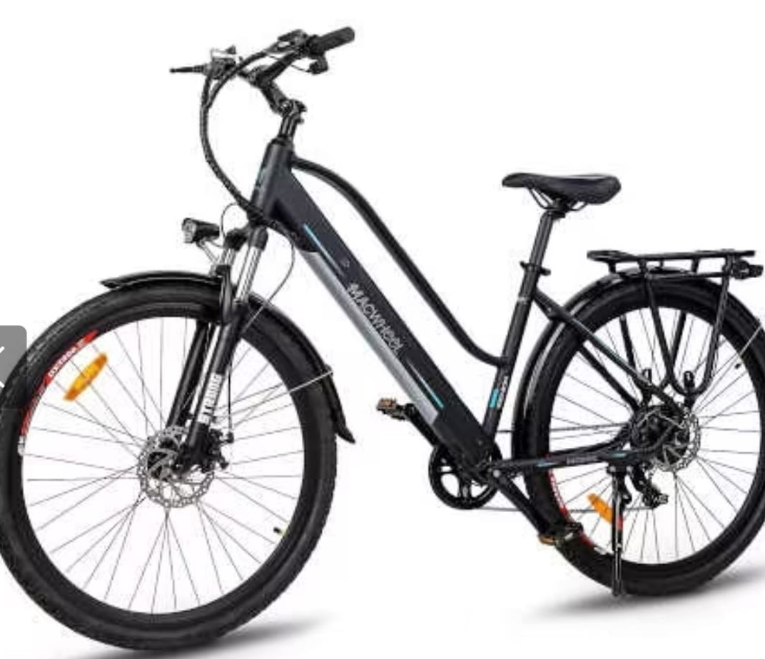 Bici elettrica, telaio nero con la scritta MACWHEEL in grigio, forcella ammortizzata, freni a disco, seggiolino bimbo nero dietro con poggiapiedi, u-lock nero e giallo chiuso sul telaio