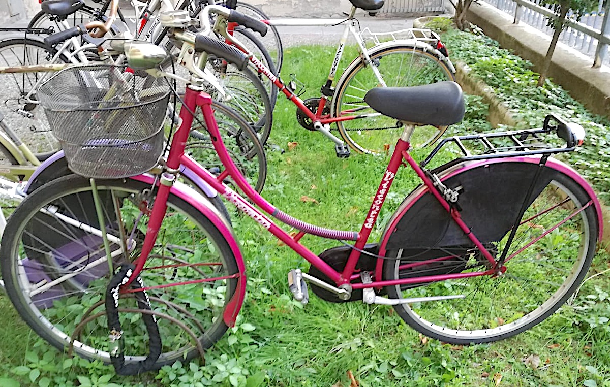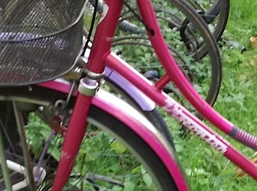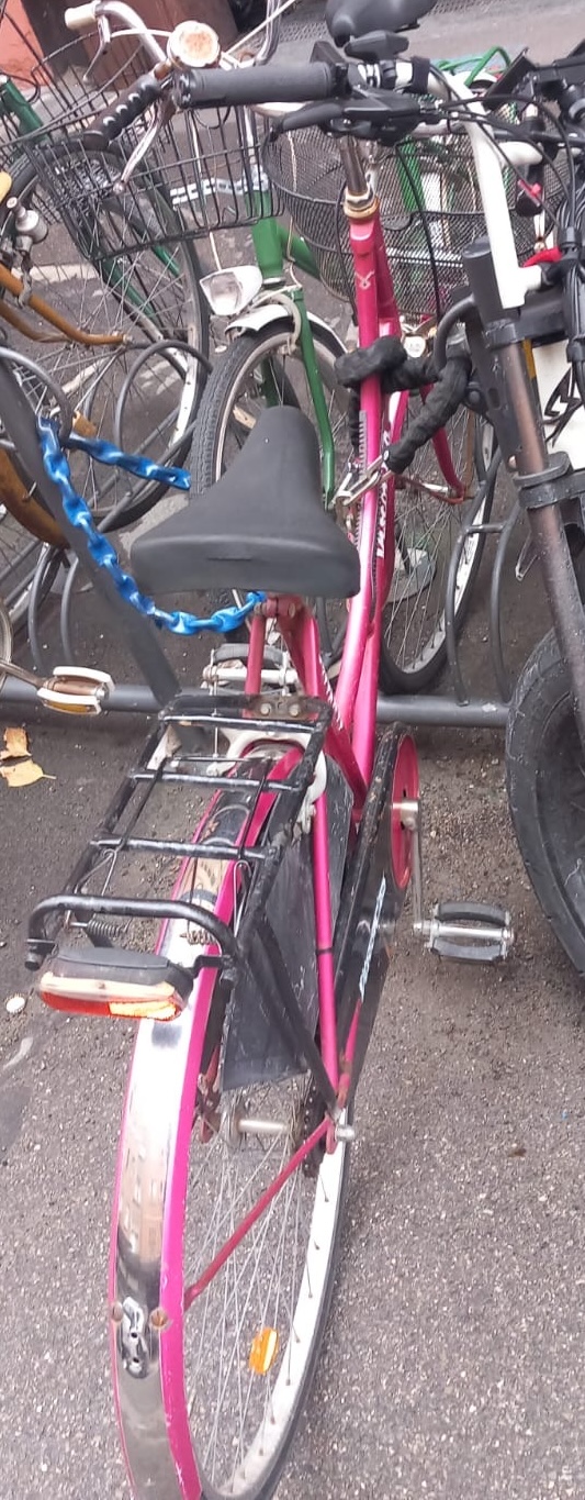 descrizione / segni particolari: Bici da donna da passeggio, telaio color fucsia con le scritte VISCONTEA in bianco, carter catena chiuso colore nero, parafanghi in metallo colore rosa, due portapacchi, cestino avanti rotto, luce rotta, freno posteriore non funzionare