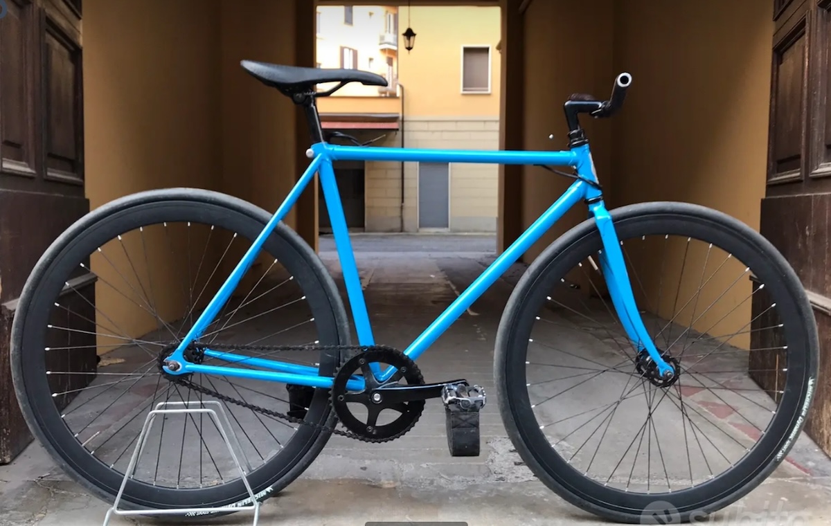 Bici stile fisse, telaio blu, ruote alto profilo nere, gruppo tutto nero, manubrio, pipa, guarnitura, sella, reggisella, catena, senza pedali
