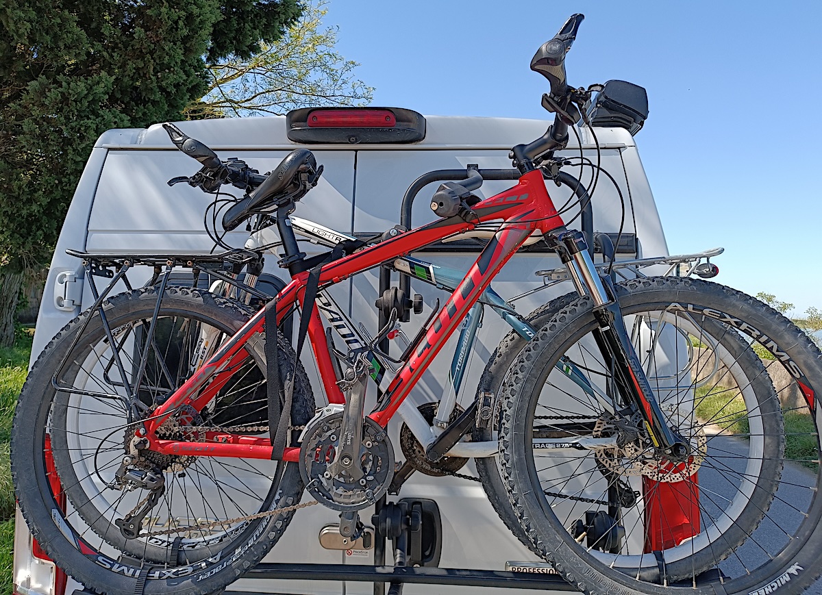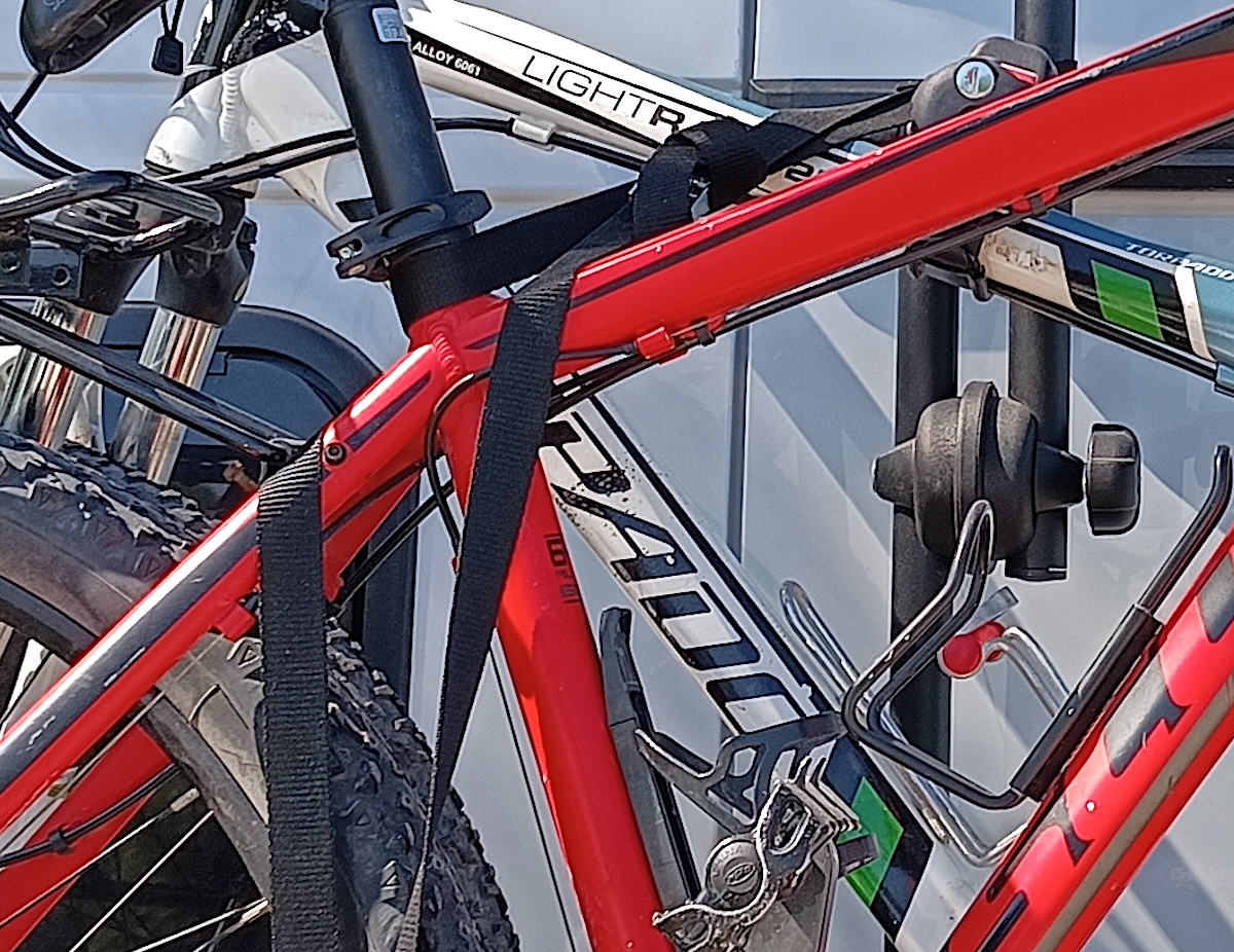 descrizione / segni particolari: Mountain bike, telaio rosso con la scritta SCOTT rossa su nero, ruote da 26", forcella nera ammortizzata marca SunTour, freni a disco, cerchi neri marca ALEX RIMS, aggiunto portapacchi nero posteriore, portaborraccia nera in metallo