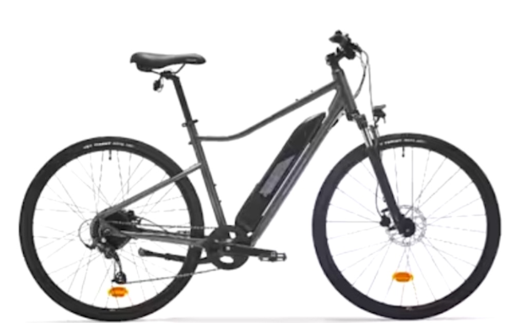 Bici elettrica, telaio grigio scuro, forcella ammortizzata, freni a disco, cestino davanti, tracking gps