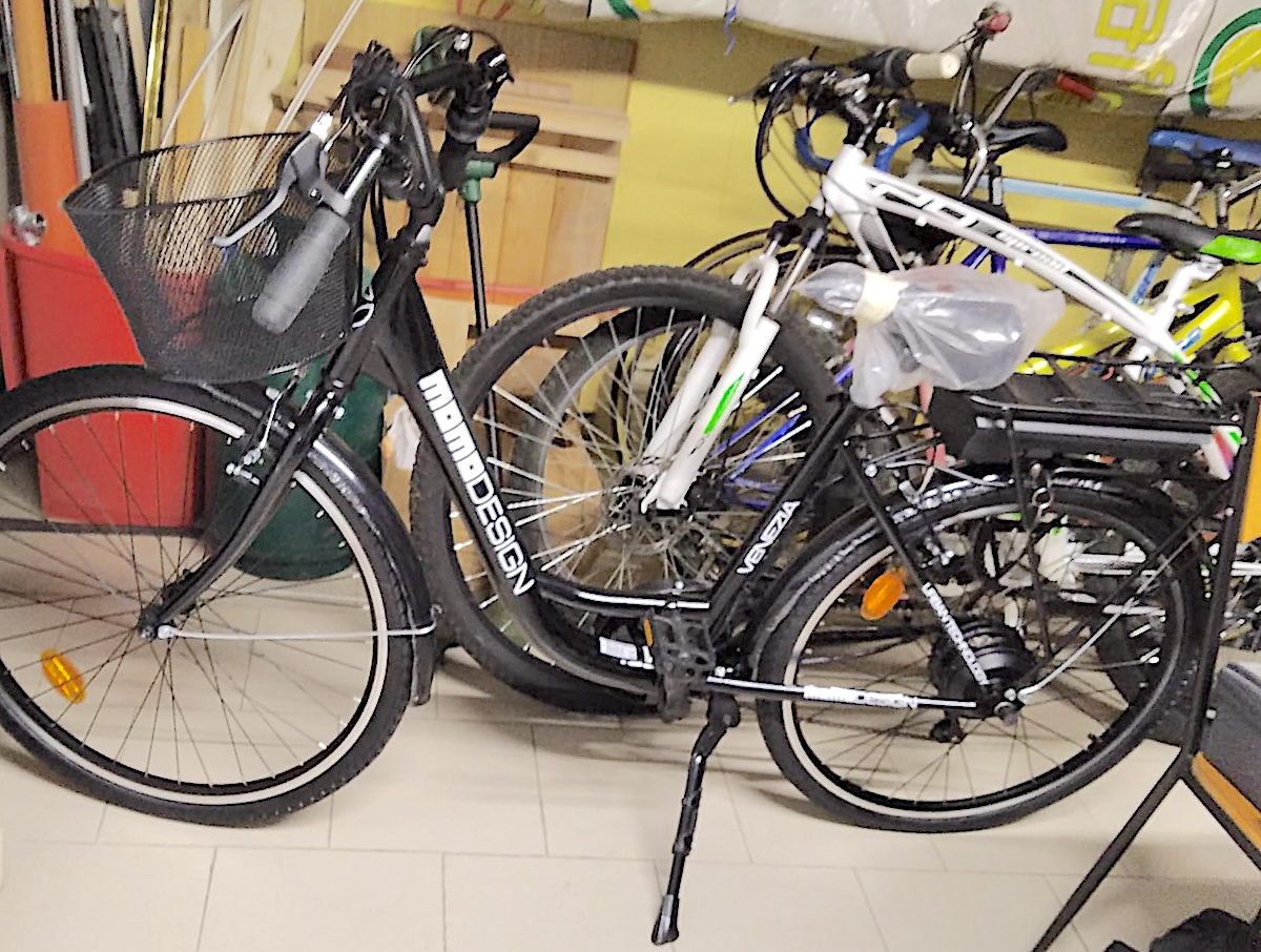 Bici elettrica, telaio nero con le scritte MOMO DESIGN e Venezia