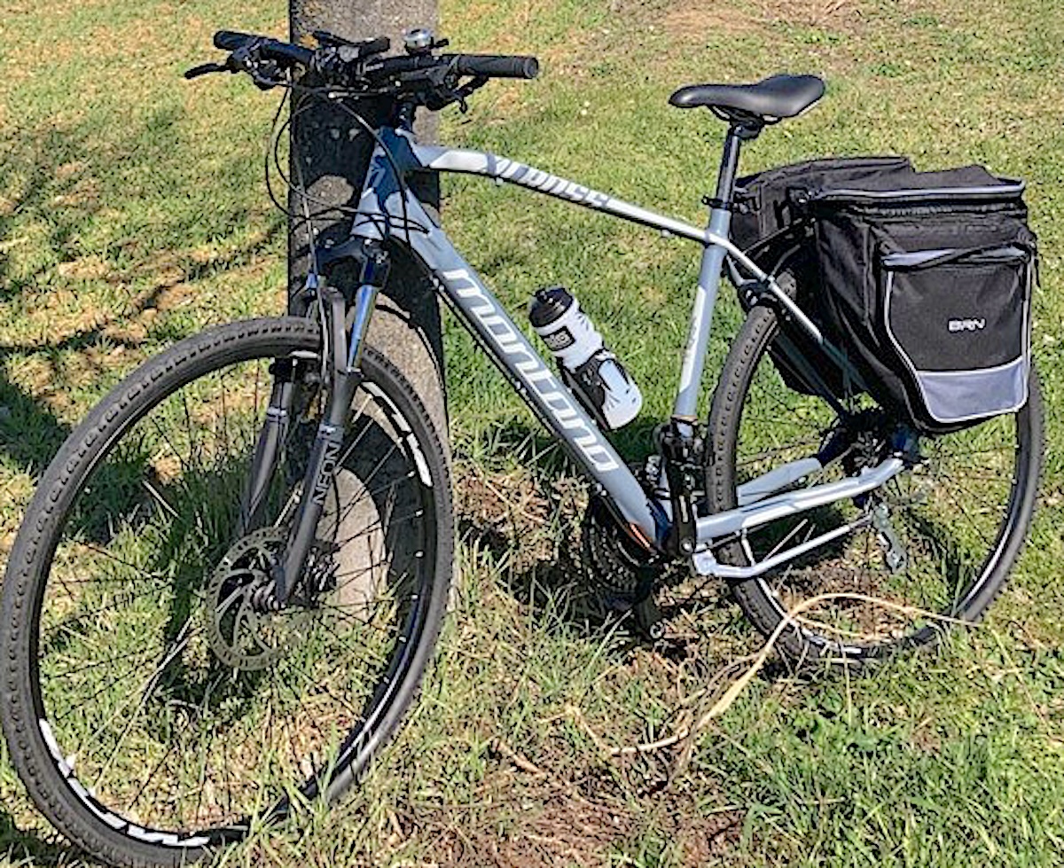 descrizione / segni particolari: Bici stile trekking, telaio grigio con le scritte MONTANA e X-CROSS in bianco, forcella nera ammortizzata con la scritte NEON, freni a disco, portapacchi posteriore nero, attrezzata con computer, luci anteriori e posteriori, borse da viaggio posteriori