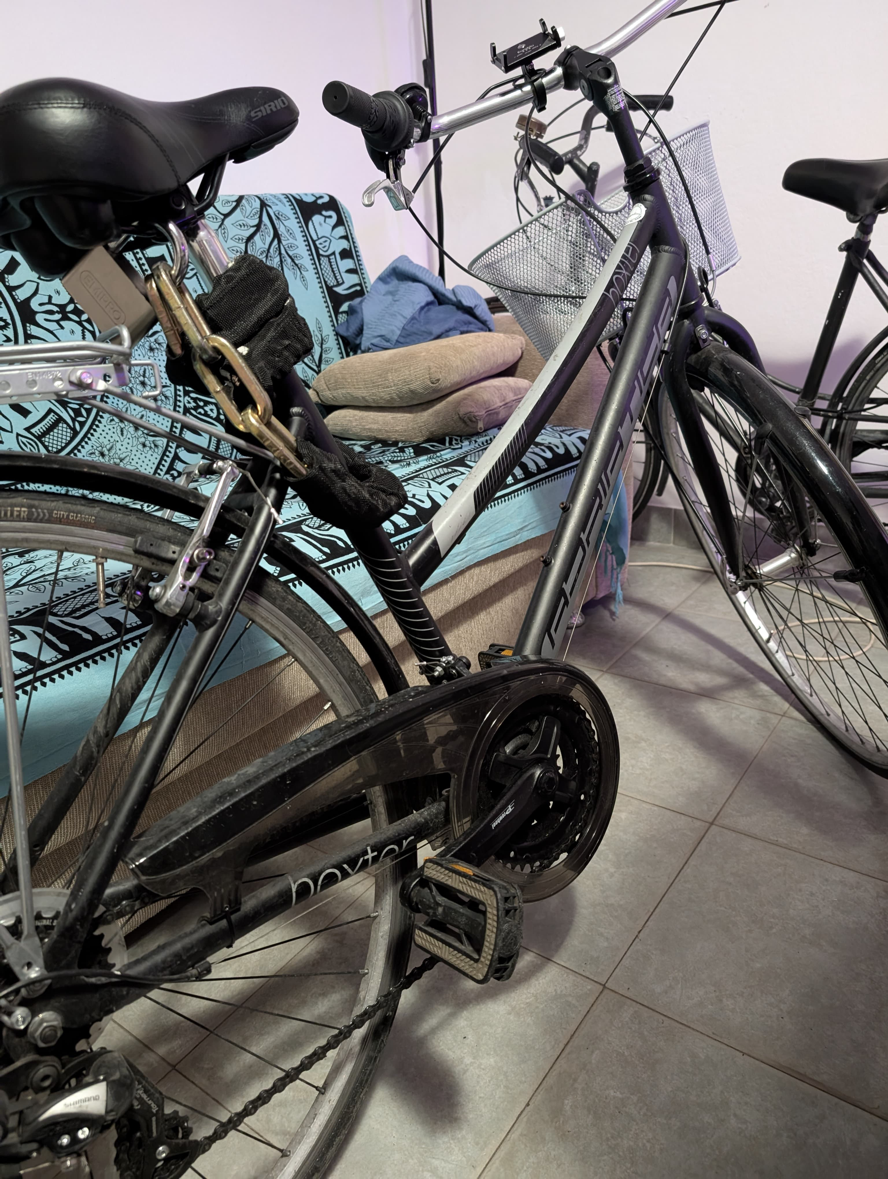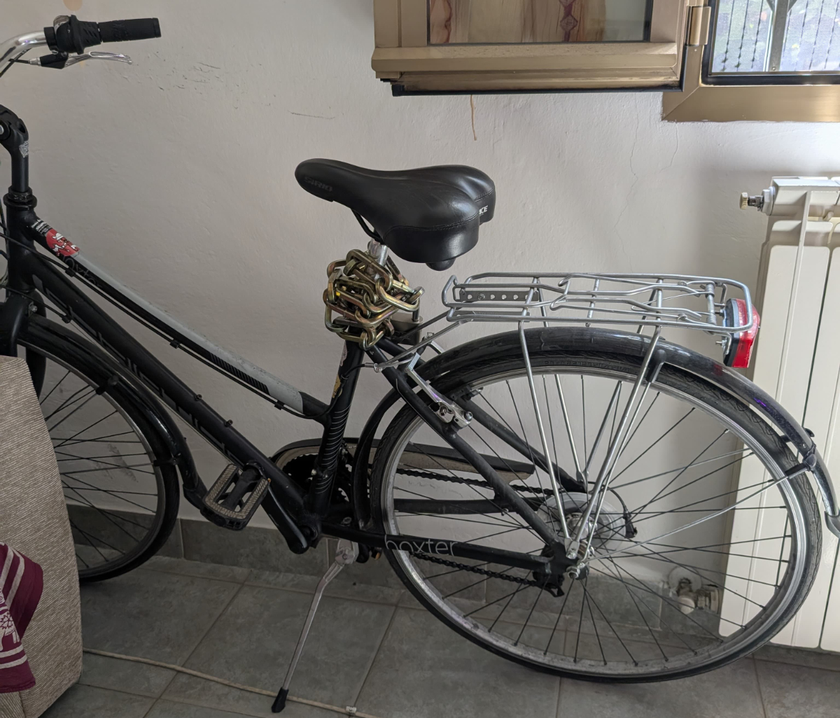 descrizione / segni particolari: ruote da 28", Cambio a 21, La bici presenta un cestello anteriore bianco e un portapacchi color argento posteriore. Presenta due adesivi sul corpo centrale: uno rosso con un guerriero ed uno rosa con la scritta "GILDA". Presentava sul davanti, sotto il cestello una luce bianca. Posteriormente un fanalino rosso.