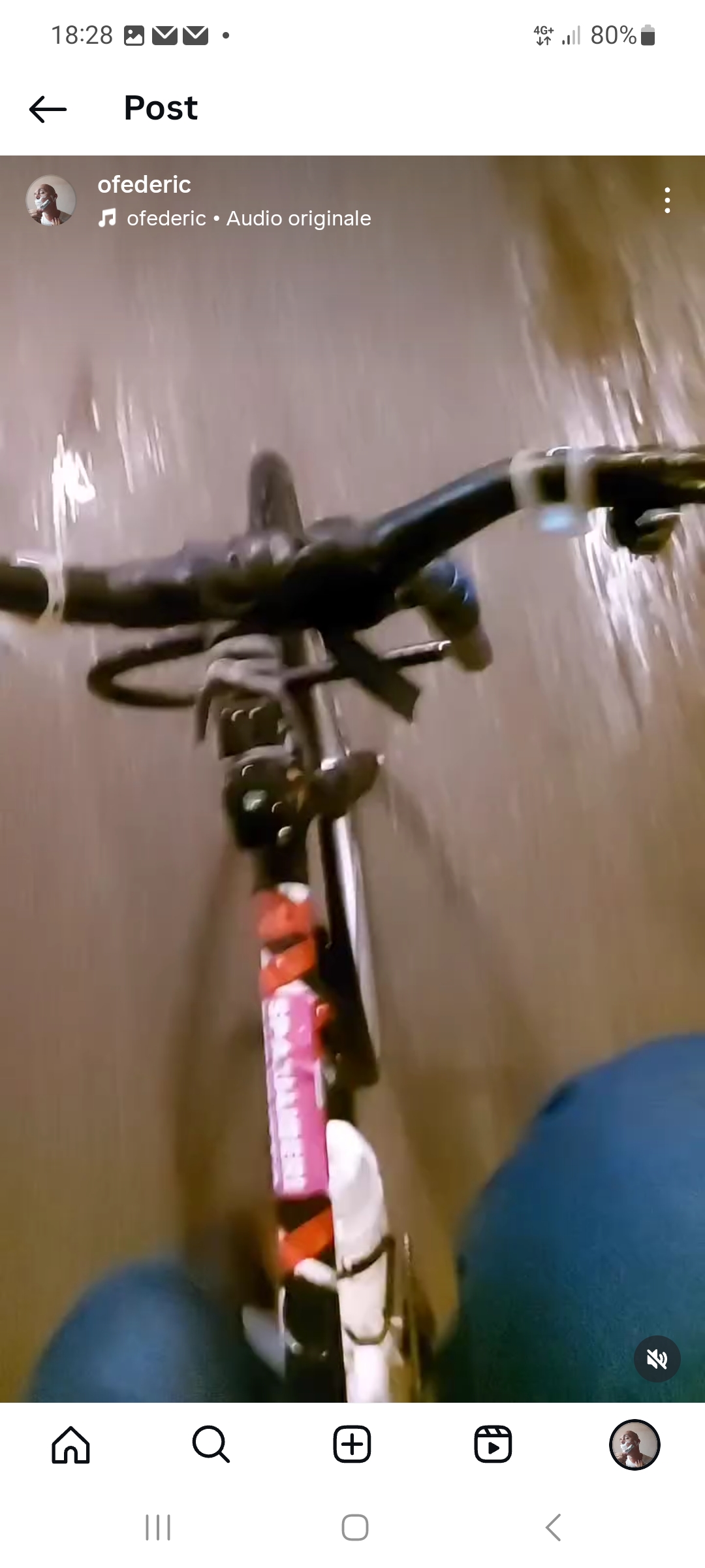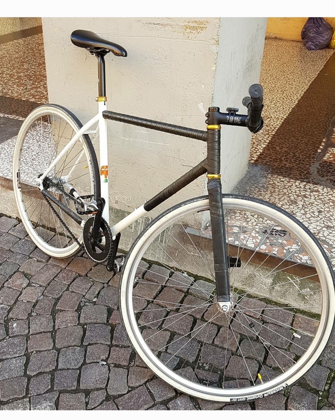 descrizione / segni particolari: Telaio sportivo verniciato di bianco, con molti adesivi e camere d'aria arrotolate, manubrio mtb nero in alluminio, manopole in gomma nere