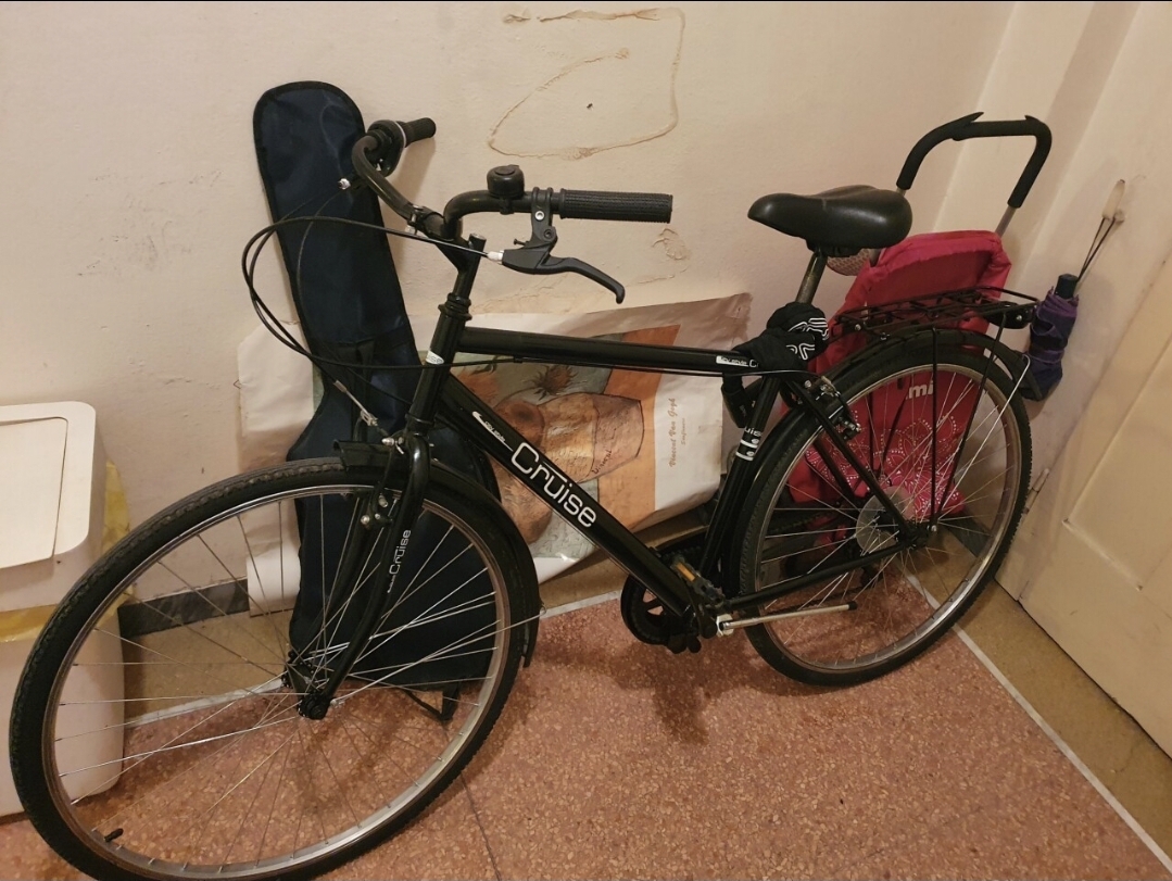 City bike nera da uomo con la scritta CRUISE in bianco, copricatena in plastica rotta, portapacchi posteriore,luce posteriore rotta