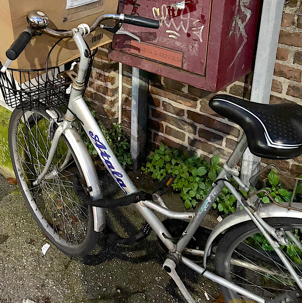 descrizione / segni particolari: Parafango anteriore sorretto da fascetta in plastica, campanello grigio e nero lato destro, luce posteriore non funzionante, cestino nero classico saldato anteriormente in modo particolarmente fisso con due perni lato manubrio