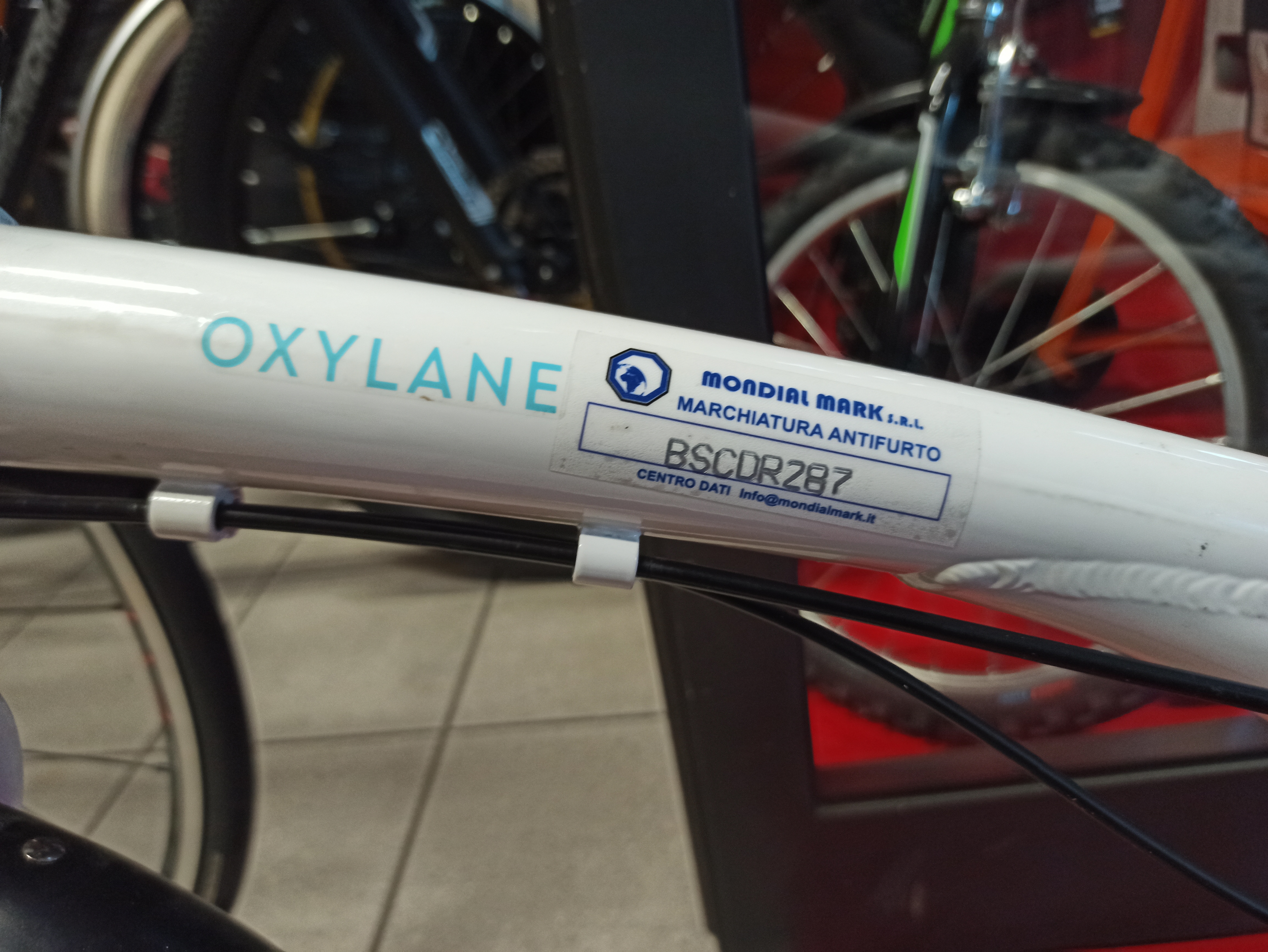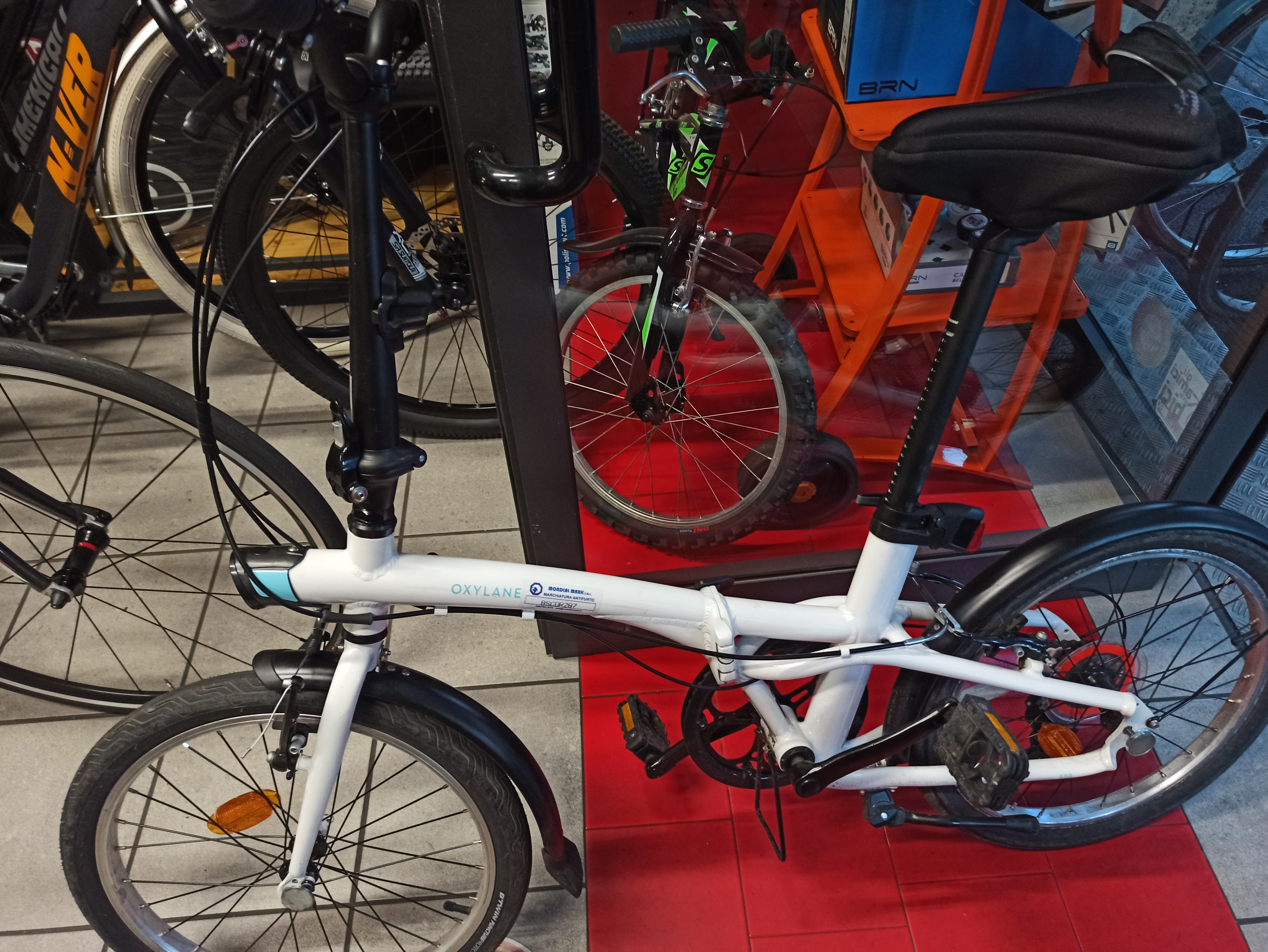 Bici pieghevole bianca con sellino e accessori neri. Adesivo "oxylane" celeste, luce posteriore. Freno anteriore staccato. Marchiata mondial mark