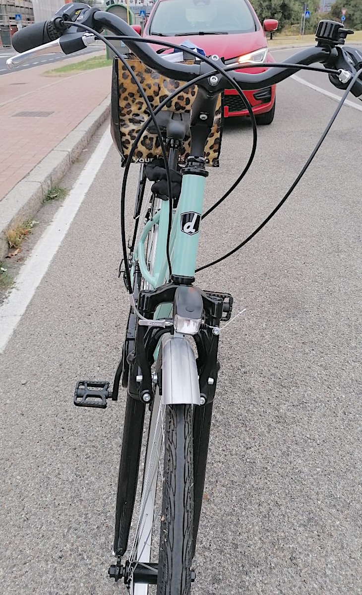 descrizione / segni particolari: Bicicletta in ottime condizioni color azzurro con cesto anteriore, con forcella anteriore nera ammortizzata, pattini dei freni posteriori consumati e rumorosi. Luce anteriore con interruttore difettoso, snodo del manubrio non perfettamente bloccato.