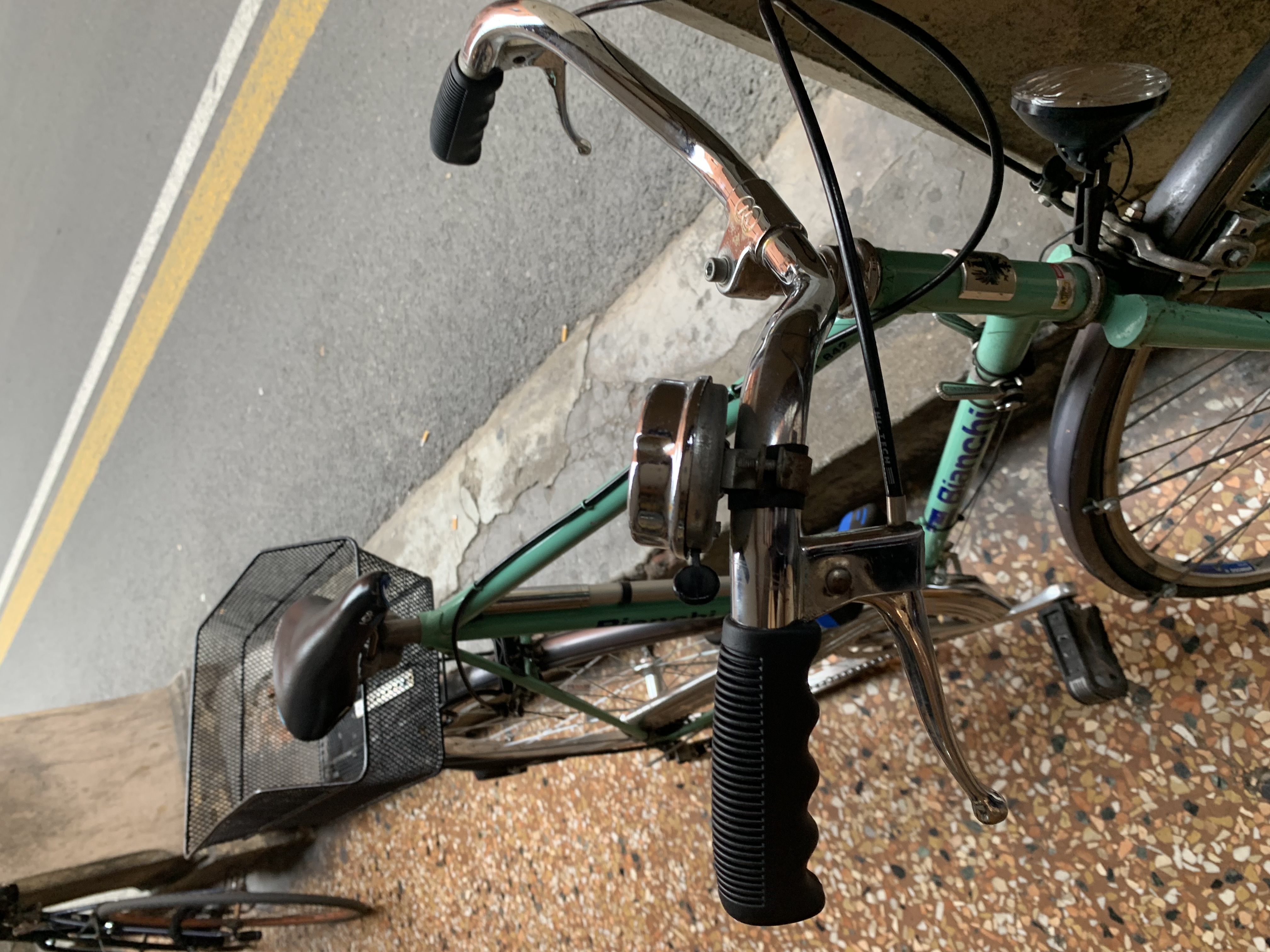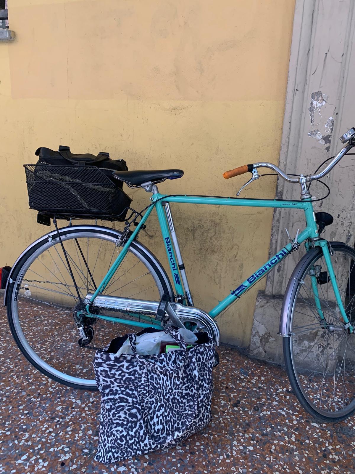 cestino dietro, ruote sottili, luce davanti, manopole nere