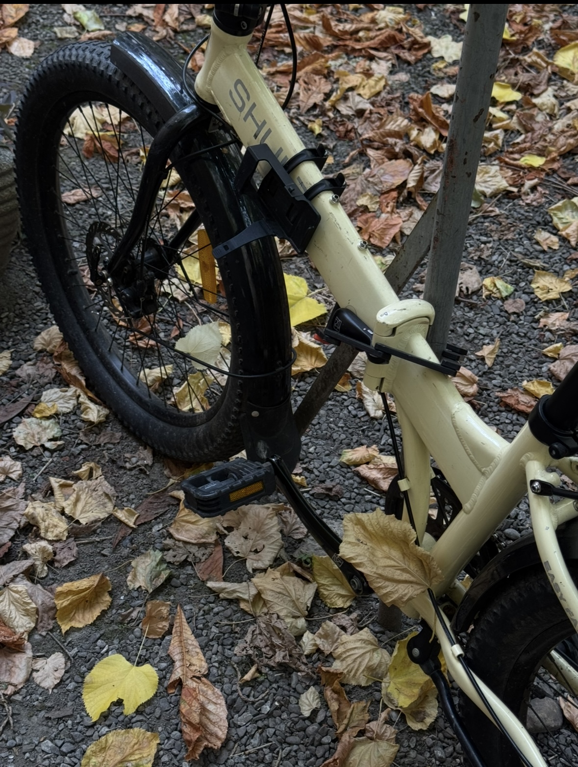 Bici pieghevole Shulz Easy Fat (marca russa), colore panna con dettagli neri e sella marrone in pelle.
