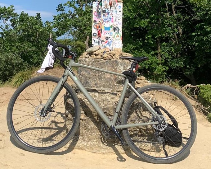 Una gravel di colore tendente al verde e con un'altra catena legata sul sedile e le luci bici cirycase quadrate davanti e dietro