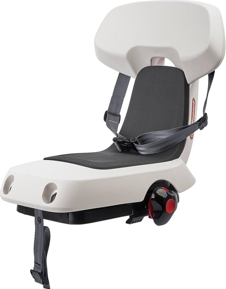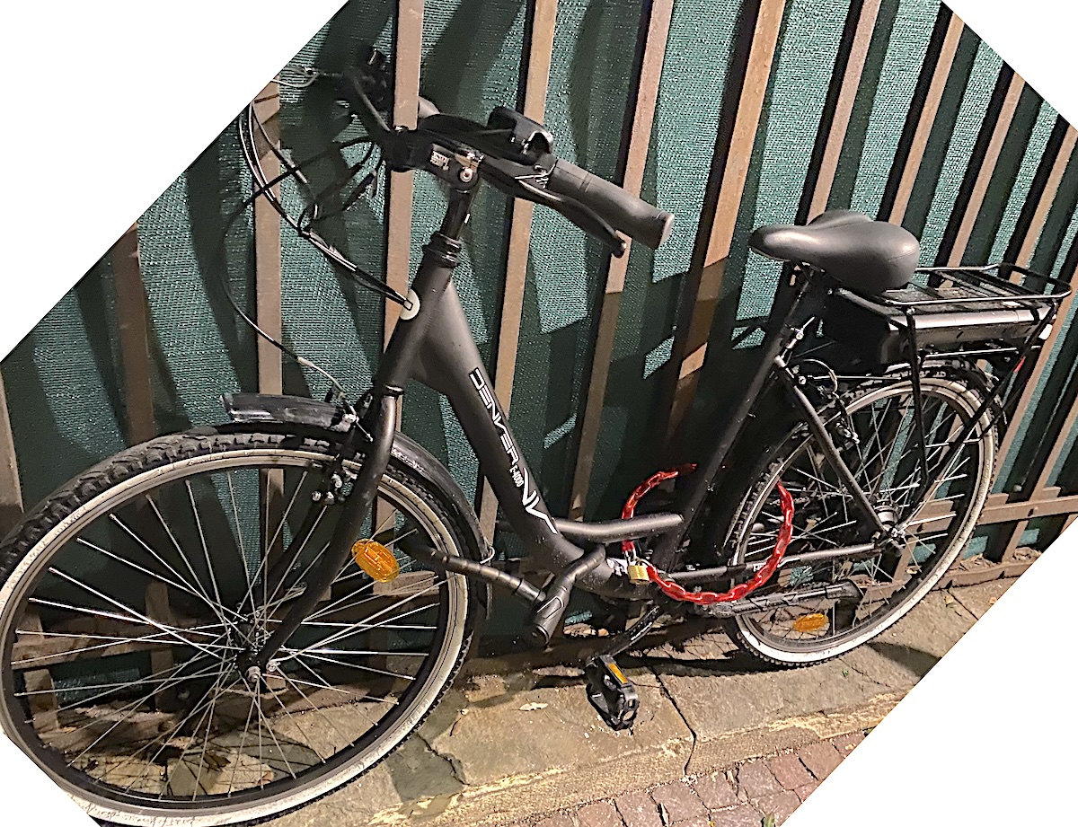 Bici elettrica da donna, telaio nero opaco con le scritte DENVER e E-4000 in bianco, specchietto retrovisore lato sinistro, copertoni con bordo bianco, seggiolino bianco e nero dietro