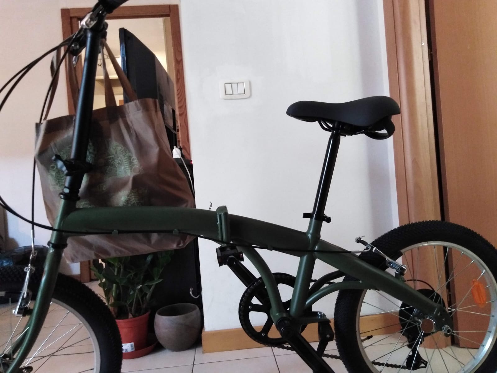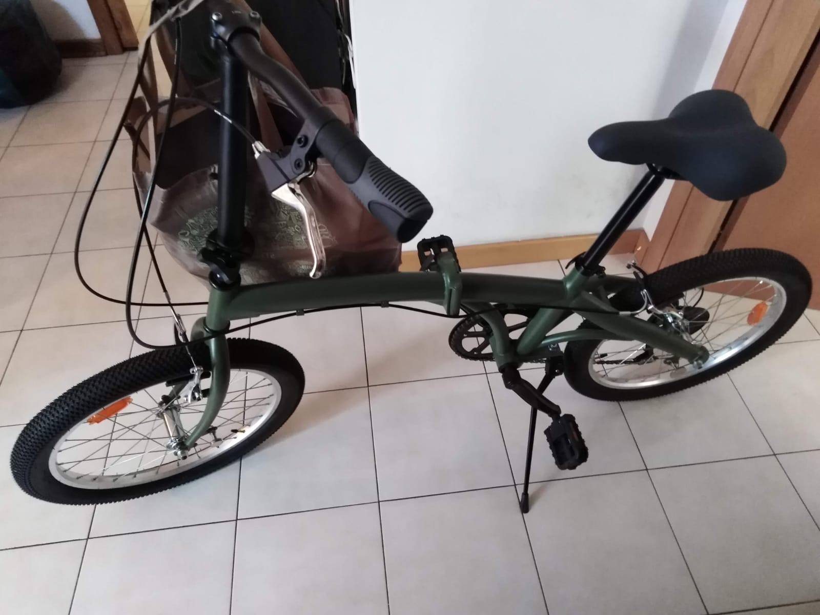Bici pieghevole verde, con ruote 20". Il sellino nero era legato al telaio con un sottile cavo d'acciaio. Pedali pieghevoli, nessun segno particolare. Ha le marce.