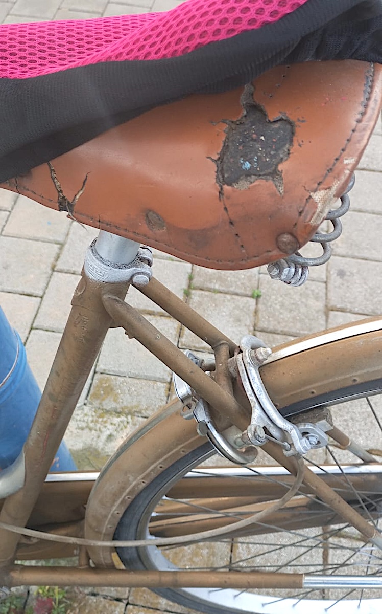 è una bici molto vecchia, marca Tosi. Ha degli adesivi azzurri laterali e posteriori del marchio. Ha un cerchio di ferro sulla ruota posteriore che funge da blocco.