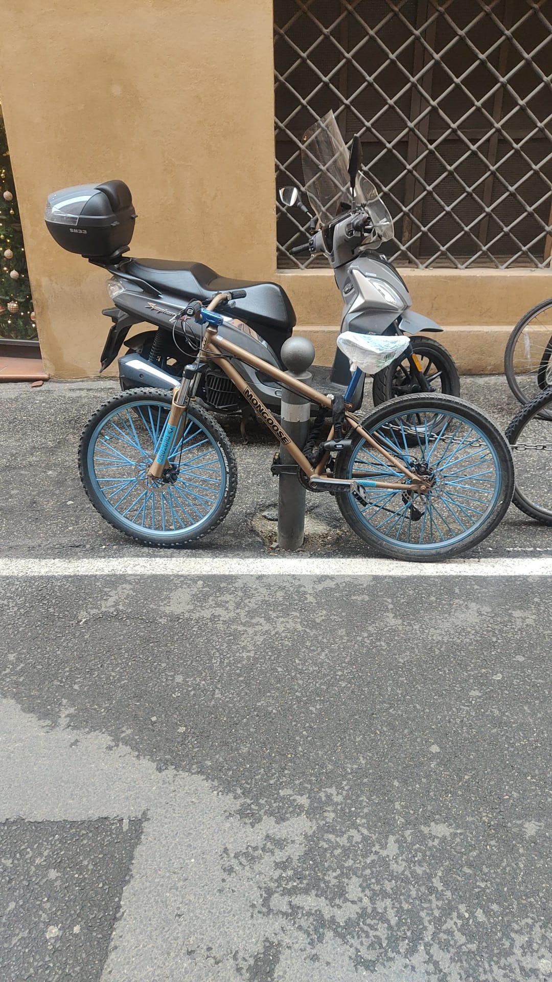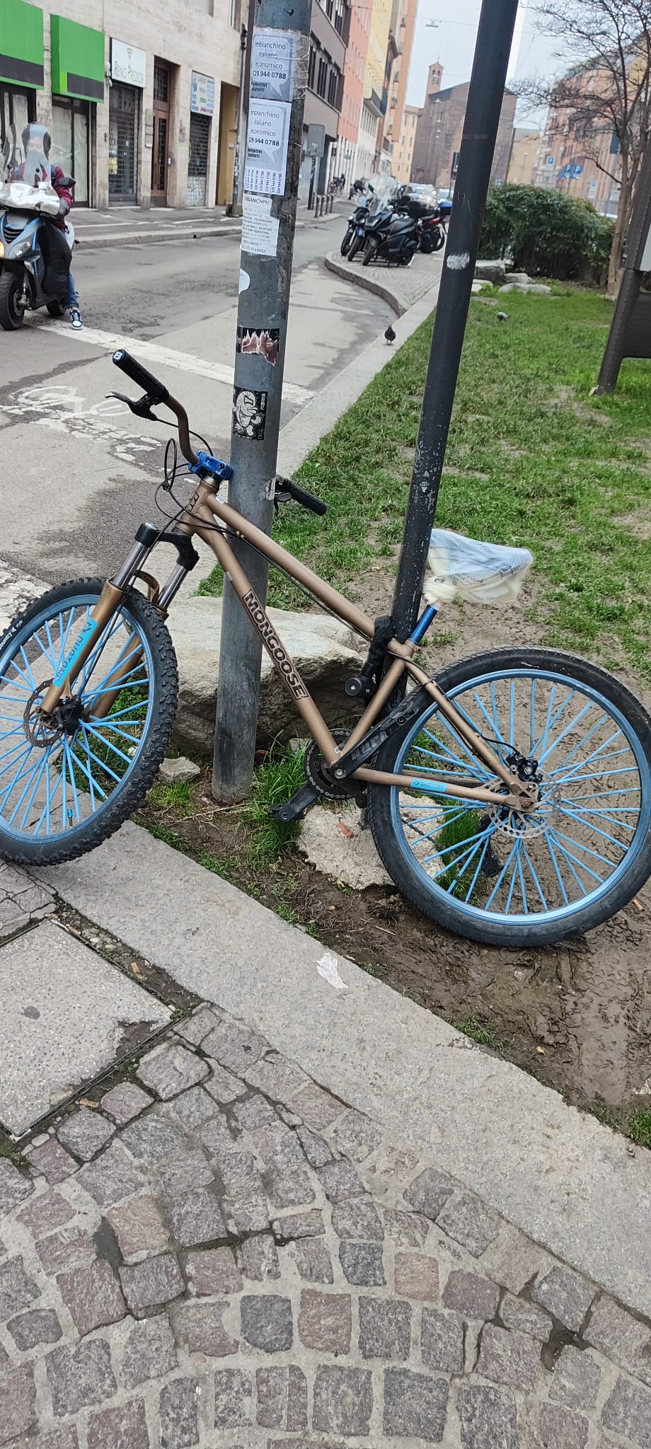 descrizione / segni particolari: La bici ha il telaio di colore oro scuro/ocra, il logo della marca "Mongoose" di colore nero sulla canna bassa del telaio, il sellino di colore nero sempre della marca "Mongoose", la canna del sellino, il blocco della forcella anteriore e i raggi di colore blu/azzurro
