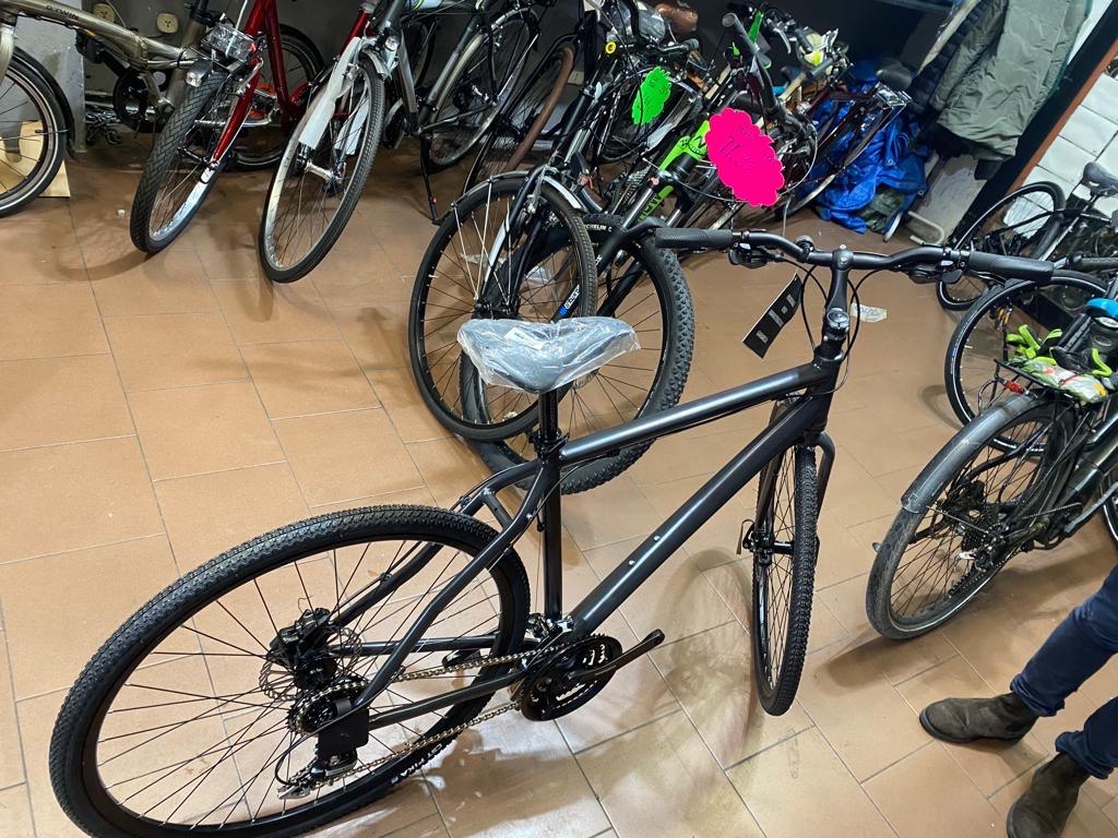 descrizione / segni particolari: telaio gravel in alluminio con manubrio mobile e freni a disco idraulici; colore completamente nera; accessoriata con parafanghi davanti e dietro + cestino quadrato davanti + cavalletta; era un po' sporca di fango, soprattutto sulle ruote; 2 catenacci, una grossa catena con copertura attaccata al cestino e un kryptonite a U attaccato al telaio e con cui era legata al palo.