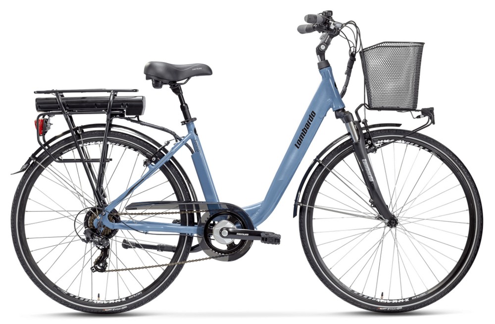 Con cestino nero di metallo, portapacchi, sellino marrone, portacatena agganciato sul tubo sotto la sella. Batteria dietro, sotto il portapacchi, motore sulla ruota posteriore