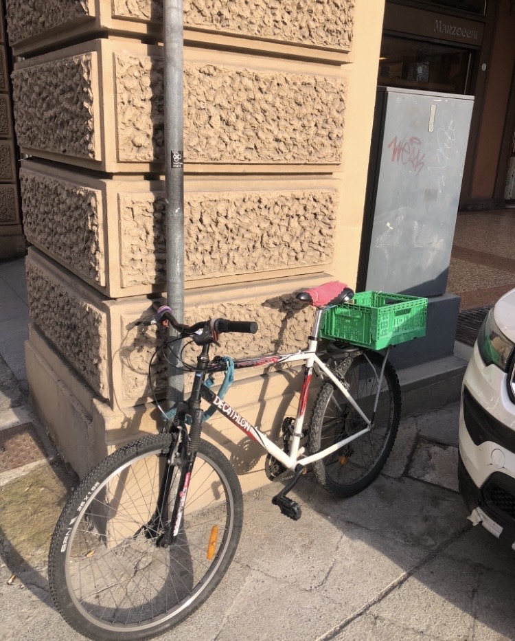Vecchia mountain bike decathlon con appoggio per cestino applicato davanti. Dietro cassettina della frutta verde