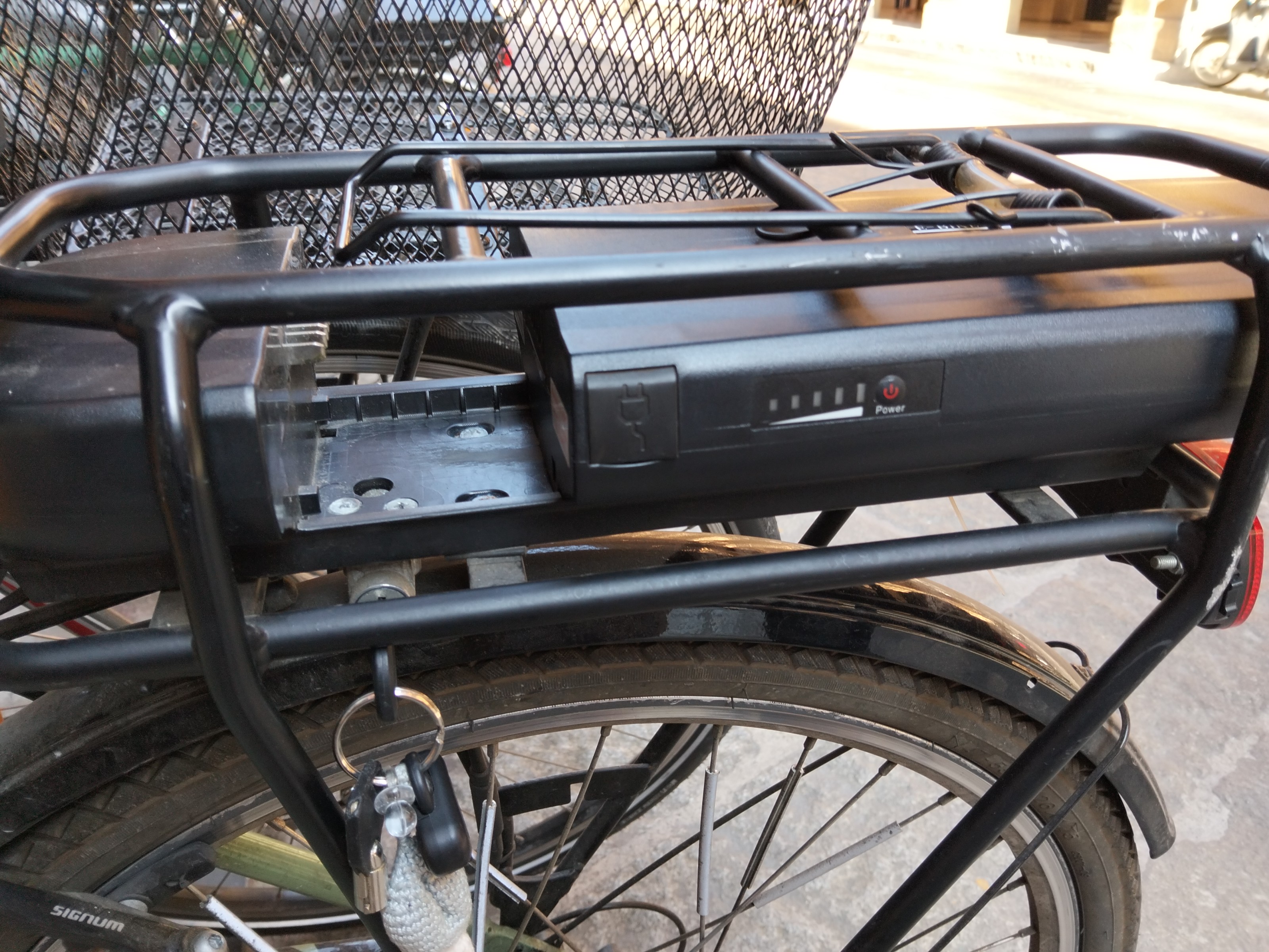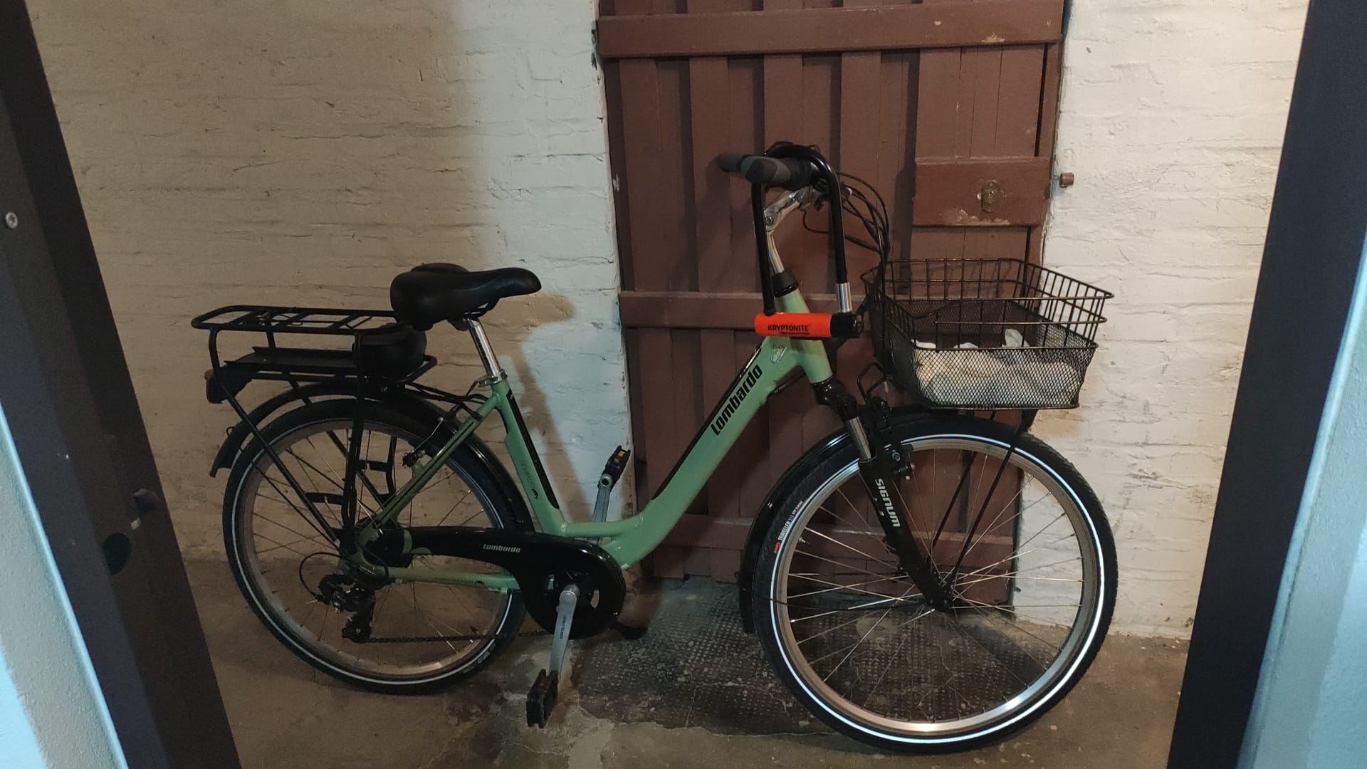 Bici Lombardo elettrica con supporto batteria posteriore un po' danneggiato e aggiustato con delle fascette. Manca la luce frontale e non c'è cestino frontale. Batteria un po' segnata ai lati per caduta bicicletta.