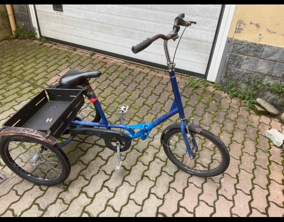 È un triciclo con cesto basso dietro, nel cesto ha la scritta viola hyper e una saldatura recente fra sella e manubrio
