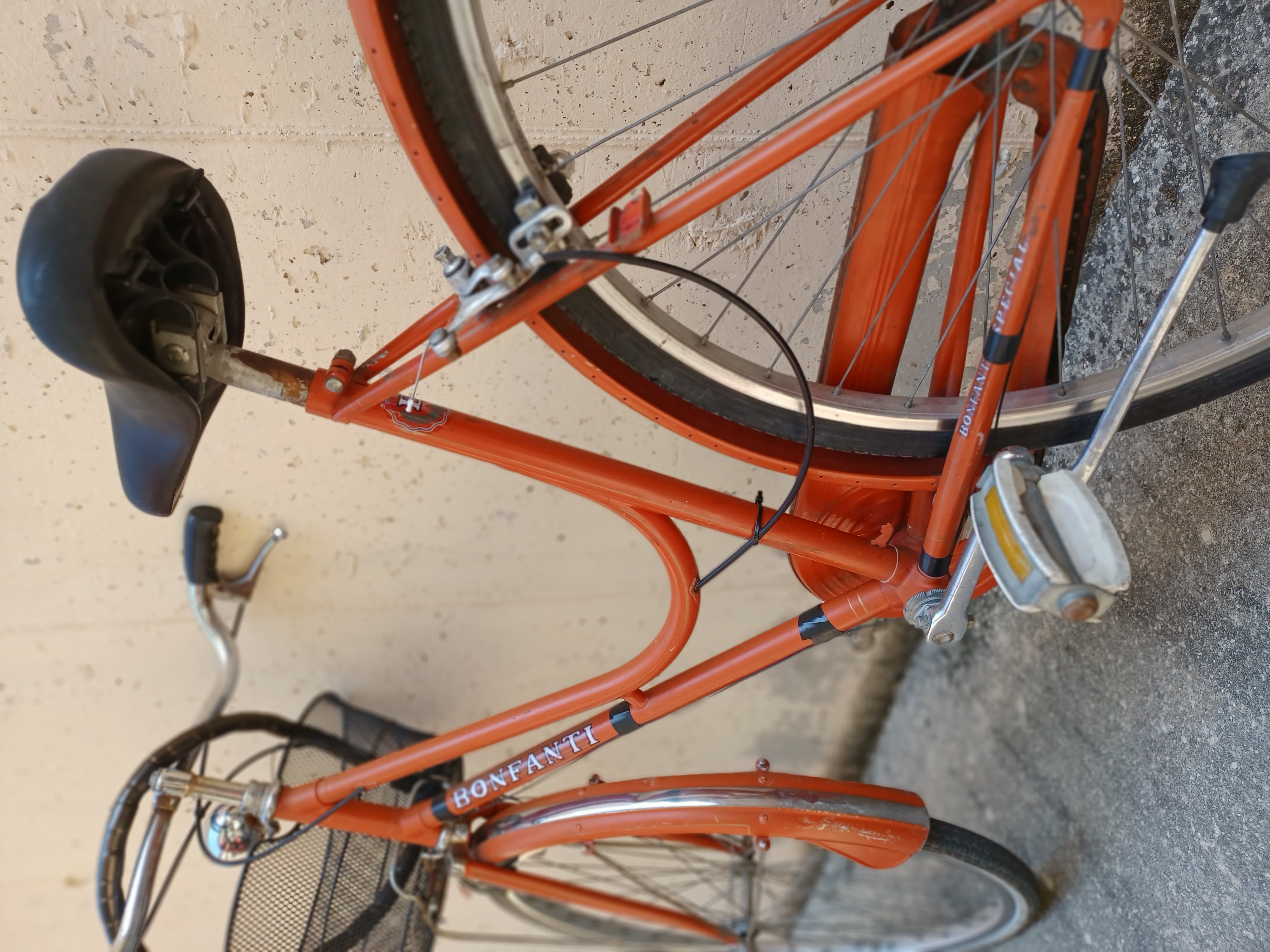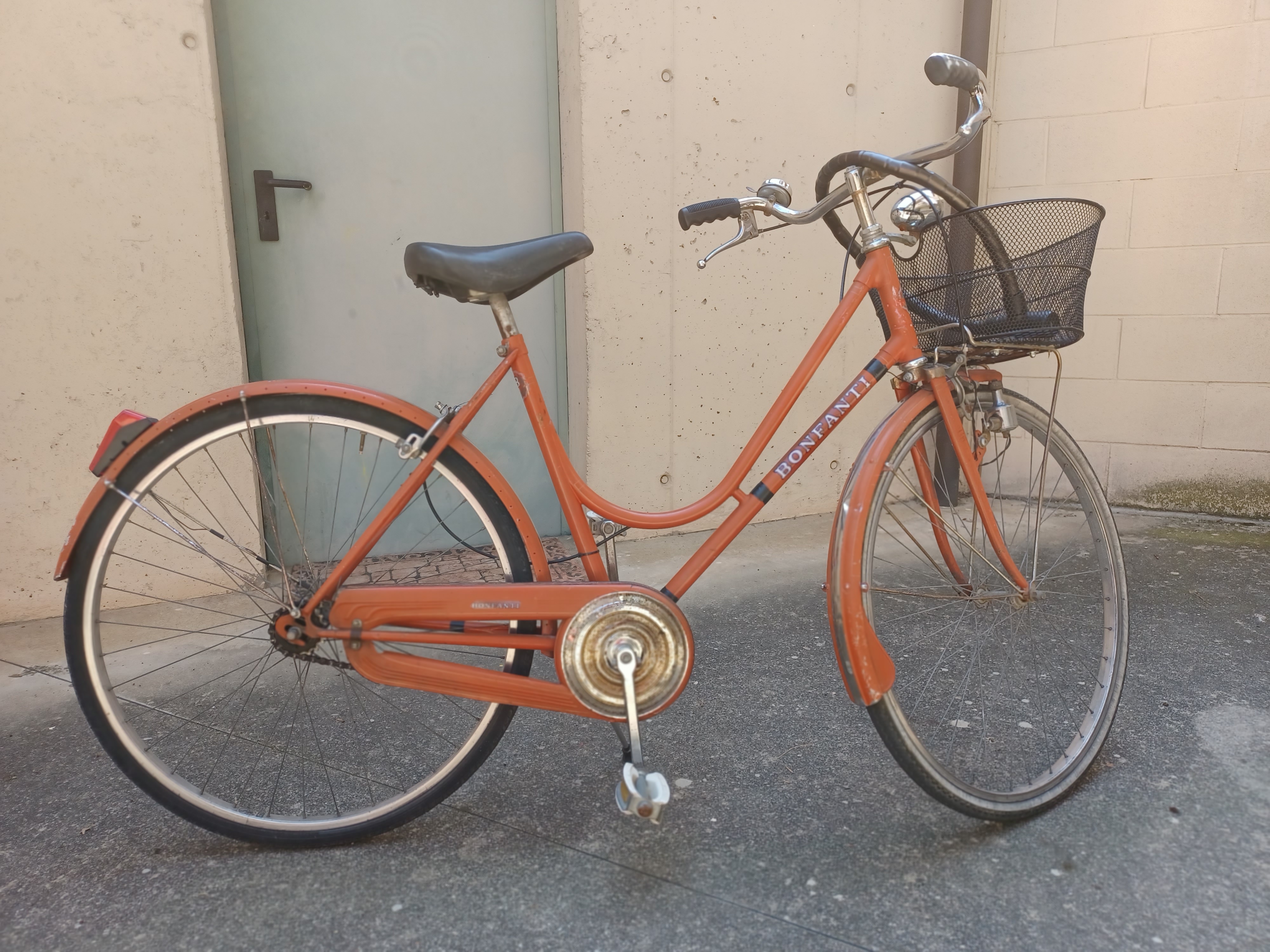 bici da donna Bonfanti completa di cestino anteriore, campanello nuovo marrone, sella e manopole nere, faro posteriore a batteria